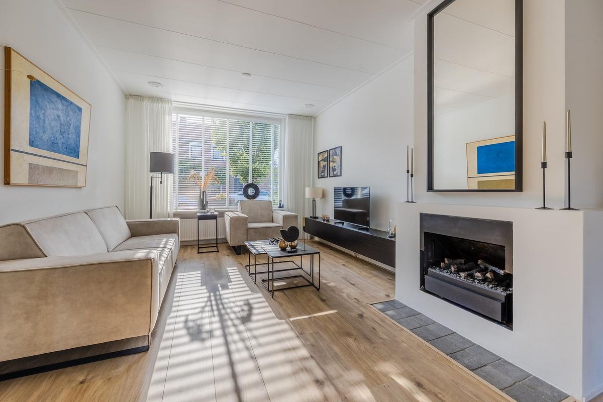 Vanuit de hal komt u in de woonkamer met een laminaatvloer en veel lichtinval door de raampartijen. De woonkamer is voorzien van een schouw met sierhaard en openslaande deuren naar de achtertuin.