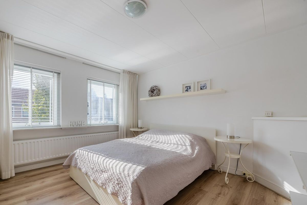 De slaapkamer is heerlijk ruim en voorzien van een laminaatvloer. Er is veel lichtinval door het dakvenster en er is veel bergruimte achter de knieschotten.