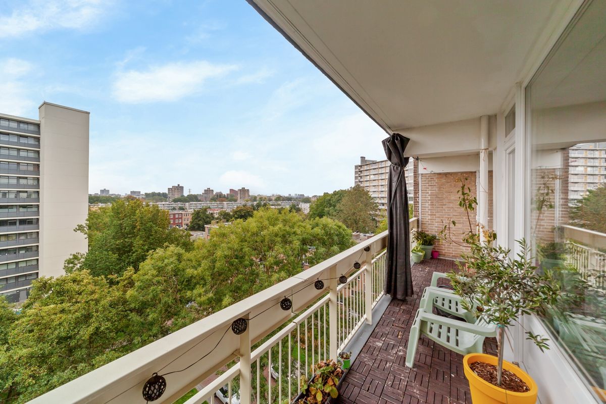 Secure entrance with mailboxes and doorbell panel, elevator to the 7th floor. Short private gallery with evening sun and views of The Hague city center and, on the other side, the greenery of De Horsten.