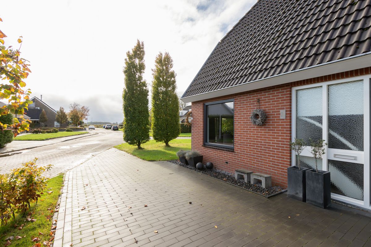 De voortuin bestaat uit gazon en enkele hoog opgesnoeide struiken. Op de oprit is voldoende parkeerruimte voor meerdere auto's.