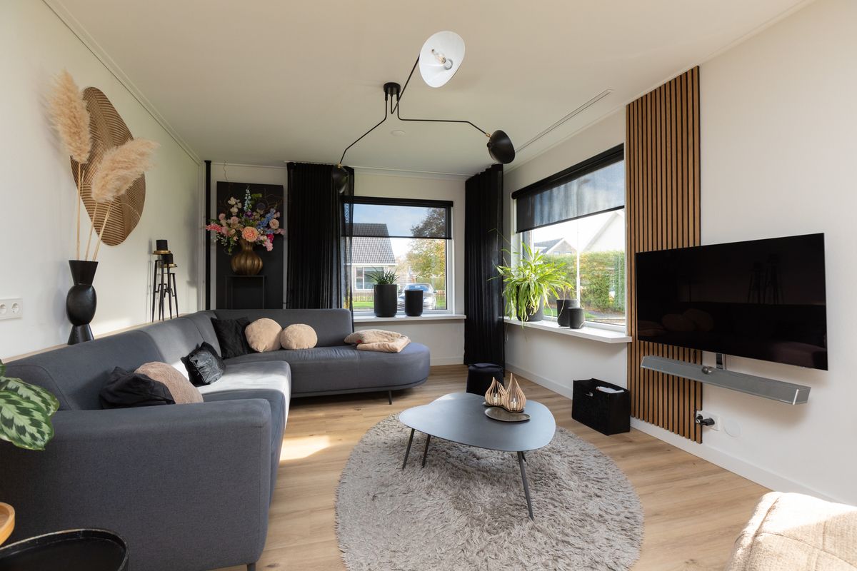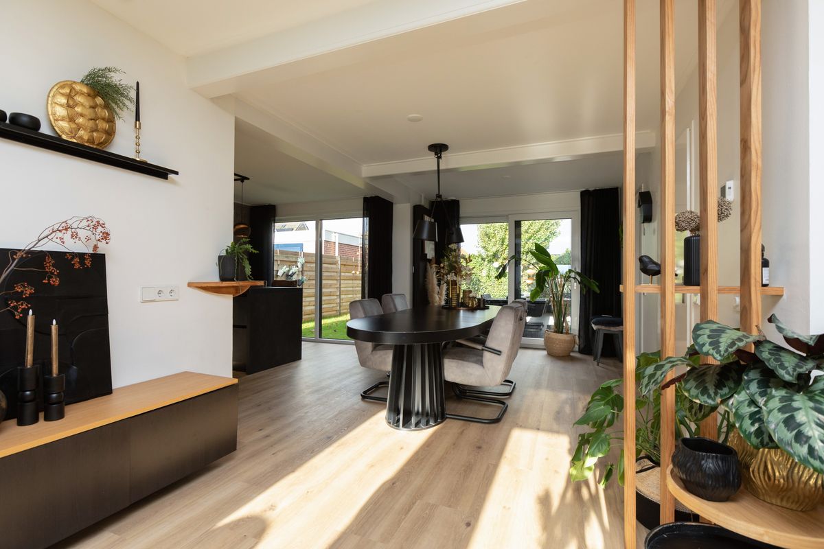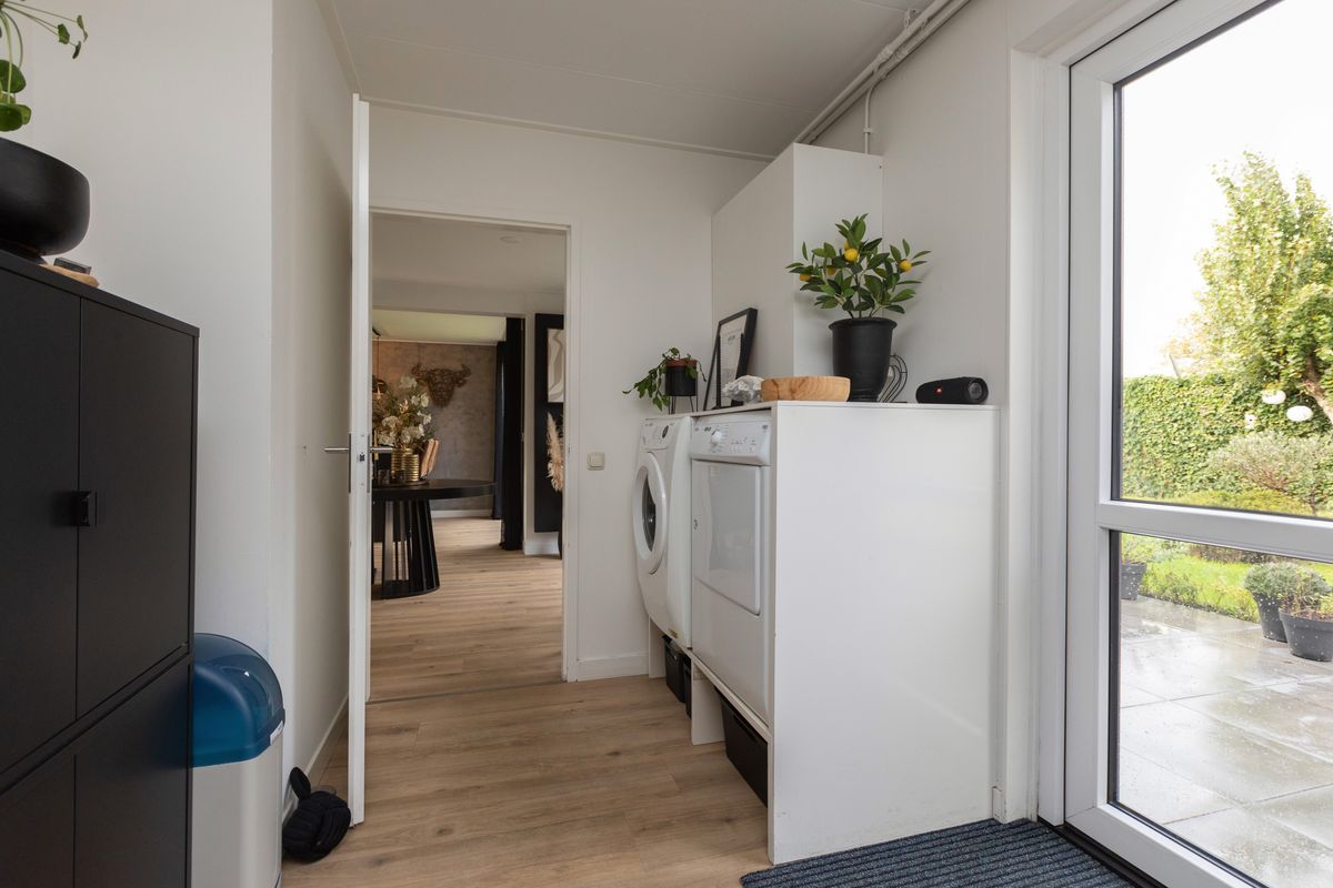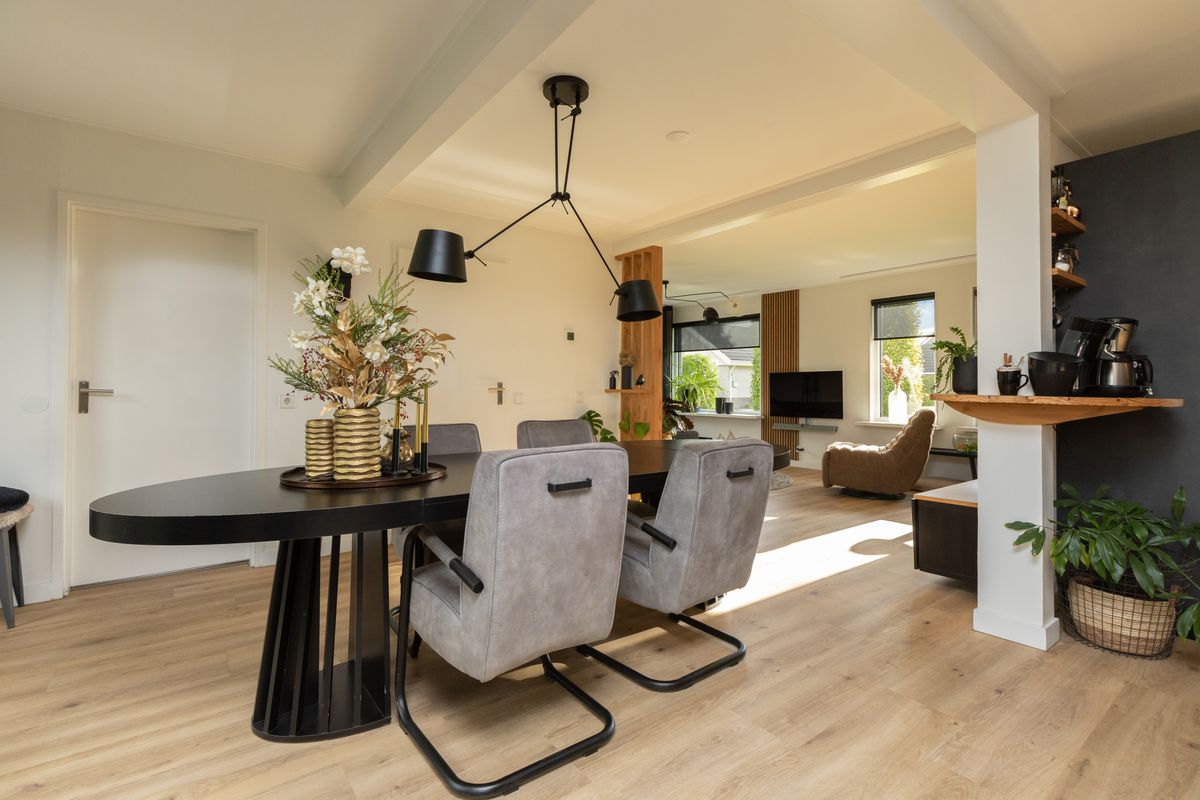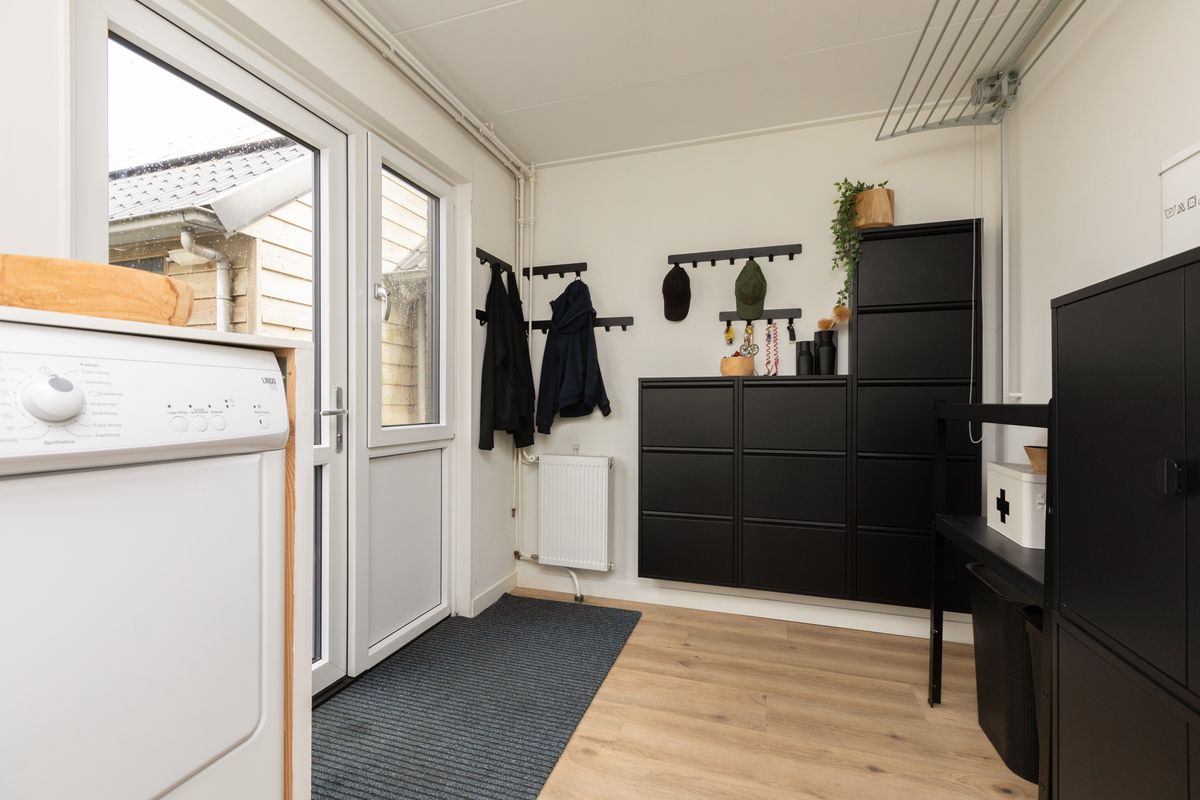 Entree, hal, meterkast, trapopgang, toilet. De ruime L-vormige woonkamer heeft veel lichtinval. Het zitgedeelte aan de voorzijde biedt een mooi zicht de straat in. De woonkamer is aan de achterzijde uitgebouwd, waardoor een groter eetgedeelte is ontstaan en een ruime keuken. De grote schuifpui geeft direct doorgang naar het terras in de achtertuin. De luxe antracietkleurige keuken bestaat uit een ruime kastenwand, een lang werkblad met bergruimte en een ontbijtbar. De keuken is voorzien van inbouwappartuur. In de bijkeuken bevinden zich de witgoedaansluitingen, de cv-opstelling en een achterdeur naar de tuin. De ruime garage/berging is voorzien van openslaande garagedeuren, elektra en water. De vide aan beide zijden zorgen voor extra bergruimte. De achtertuin is mooi verzorgd en beschikt over een terras met overkapping.
