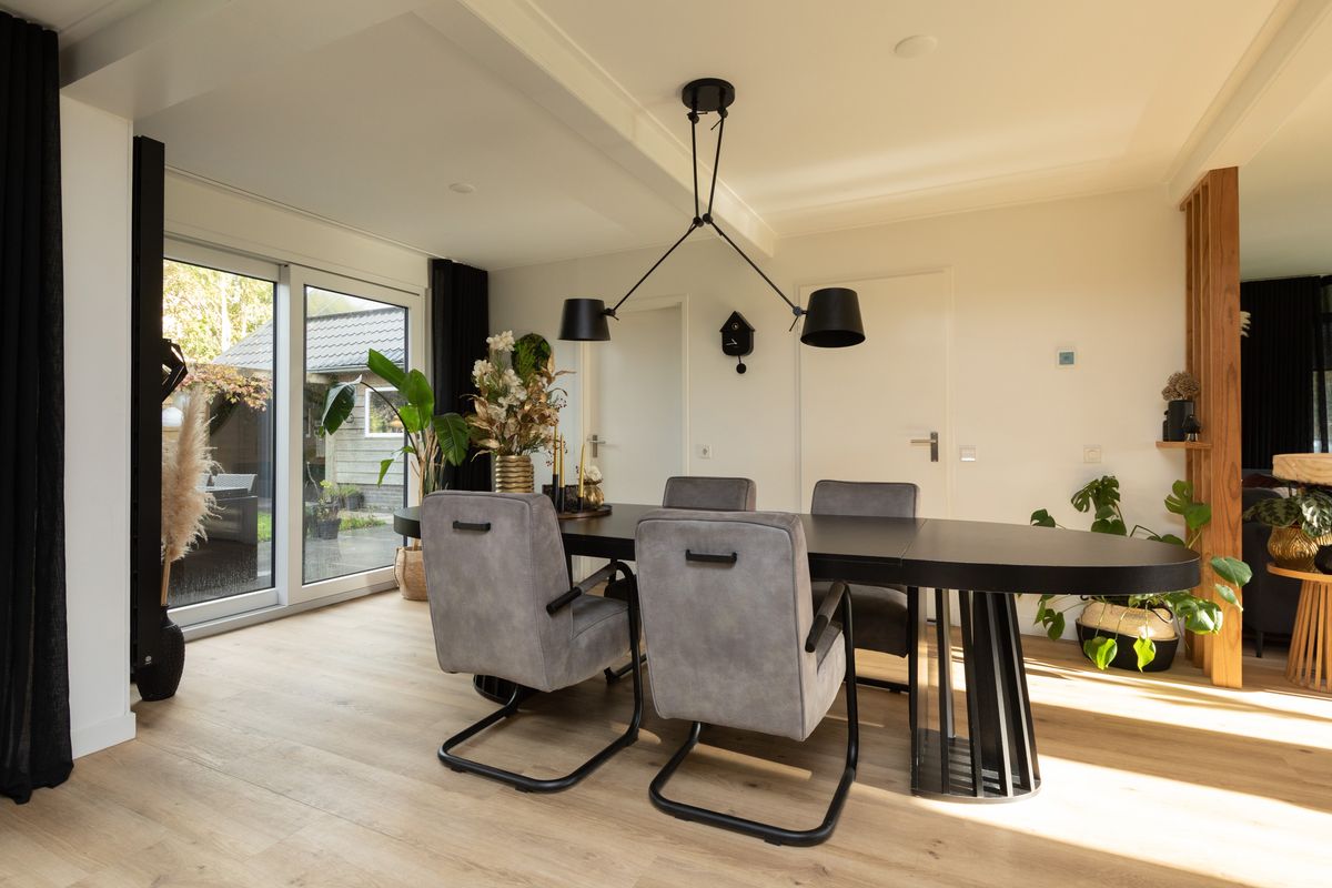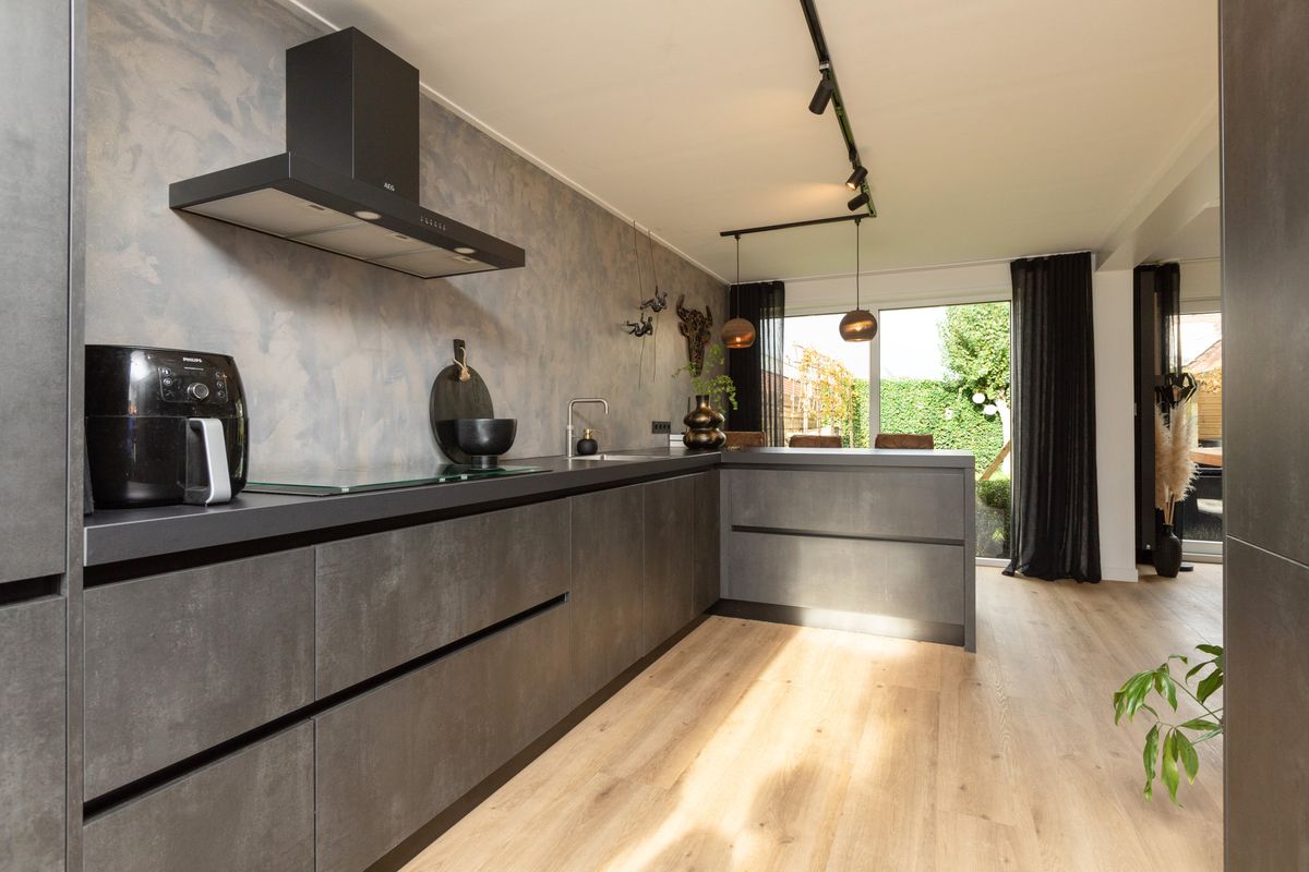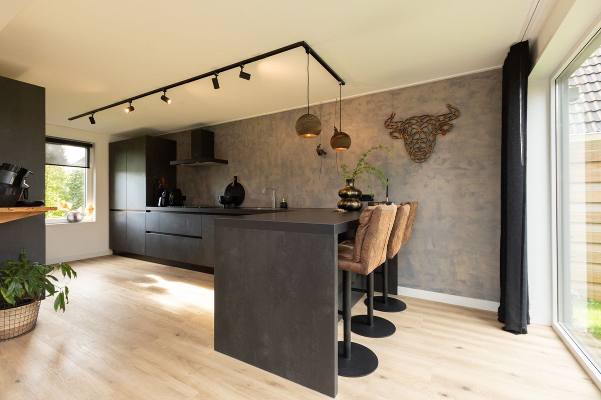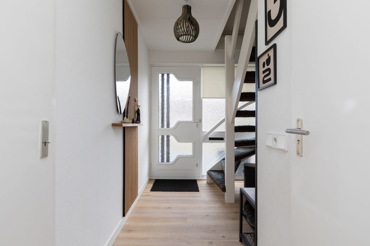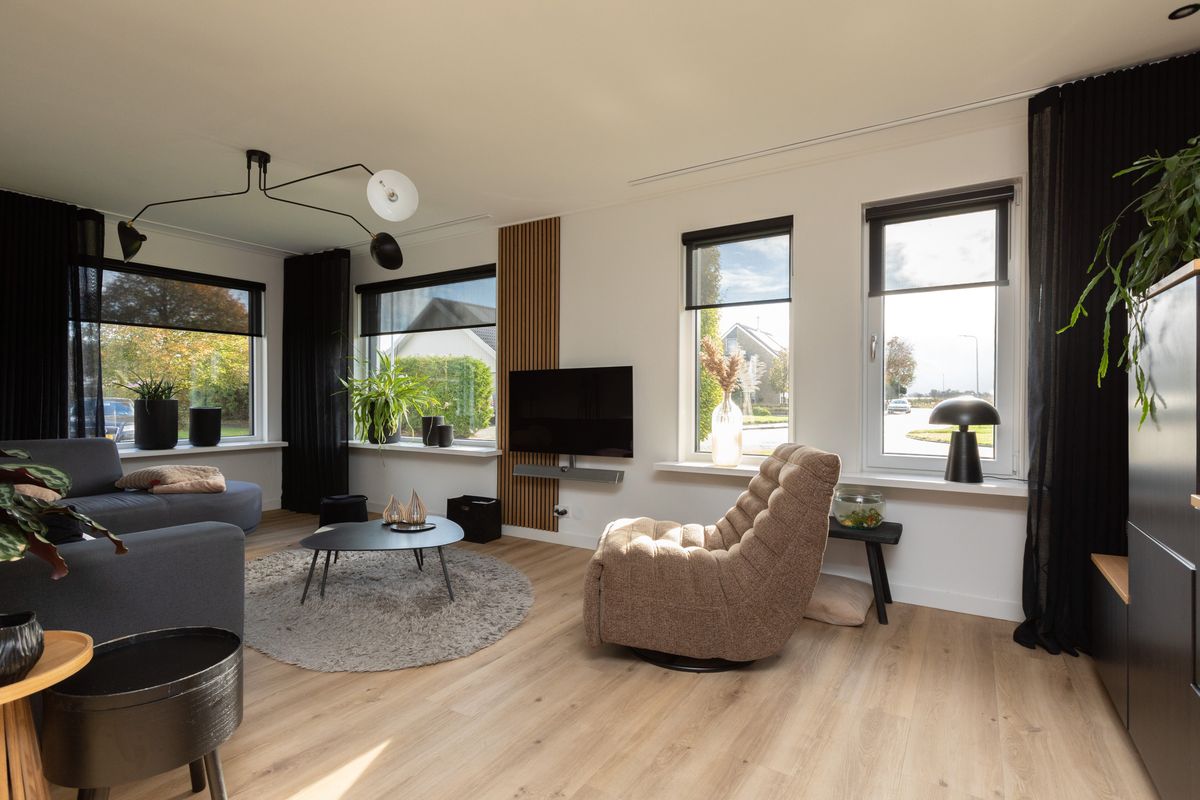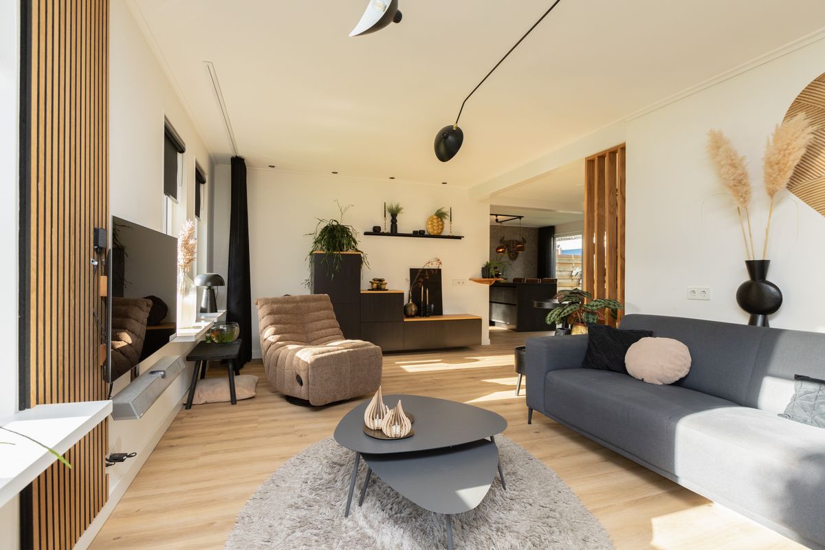 Entree, hal, meterkast, trapopgang, toilet. De ruime L-vormige woonkamer heeft veel lichtinval. Het zitgedeelte aan de voorzijde biedt een mooi zicht de straat in. De woonkamer is aan de achterzijde uitgebouwd, waardoor een groter eetgedeelte is ontstaan en een ruime keuken. De grote schuifpui geeft direct doorgang naar het terras in de achtertuin. De luxe antracietkleurige keuken bestaat uit een ruime kastenwand, een lang werkblad met bergruimte en een ontbijtbar. De keuken is voorzien van inbouwappartuur. In de bijkeuken bevinden zich de witgoedaansluitingen, de cv-opstelling en een achterdeur naar de tuin. De ruime garage/berging is voorzien van openslaande garagedeuren, elektra en water. De vide aan beide zijden zorgen voor extra bergruimte. De achtertuin is mooi verzorgd en beschikt over een terras met overkapping.
