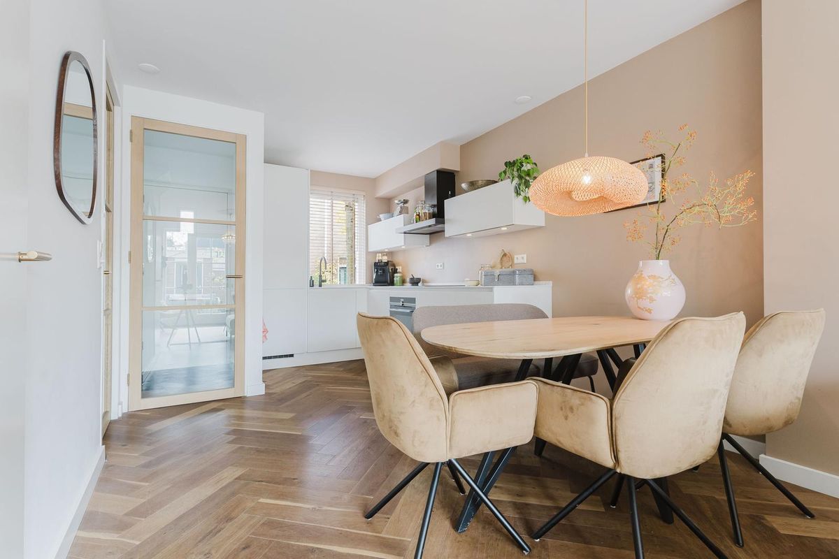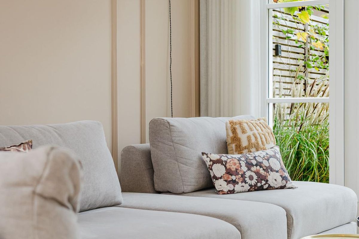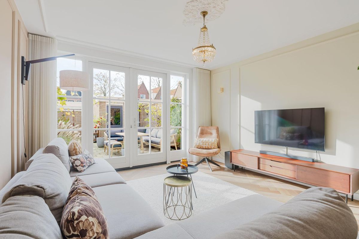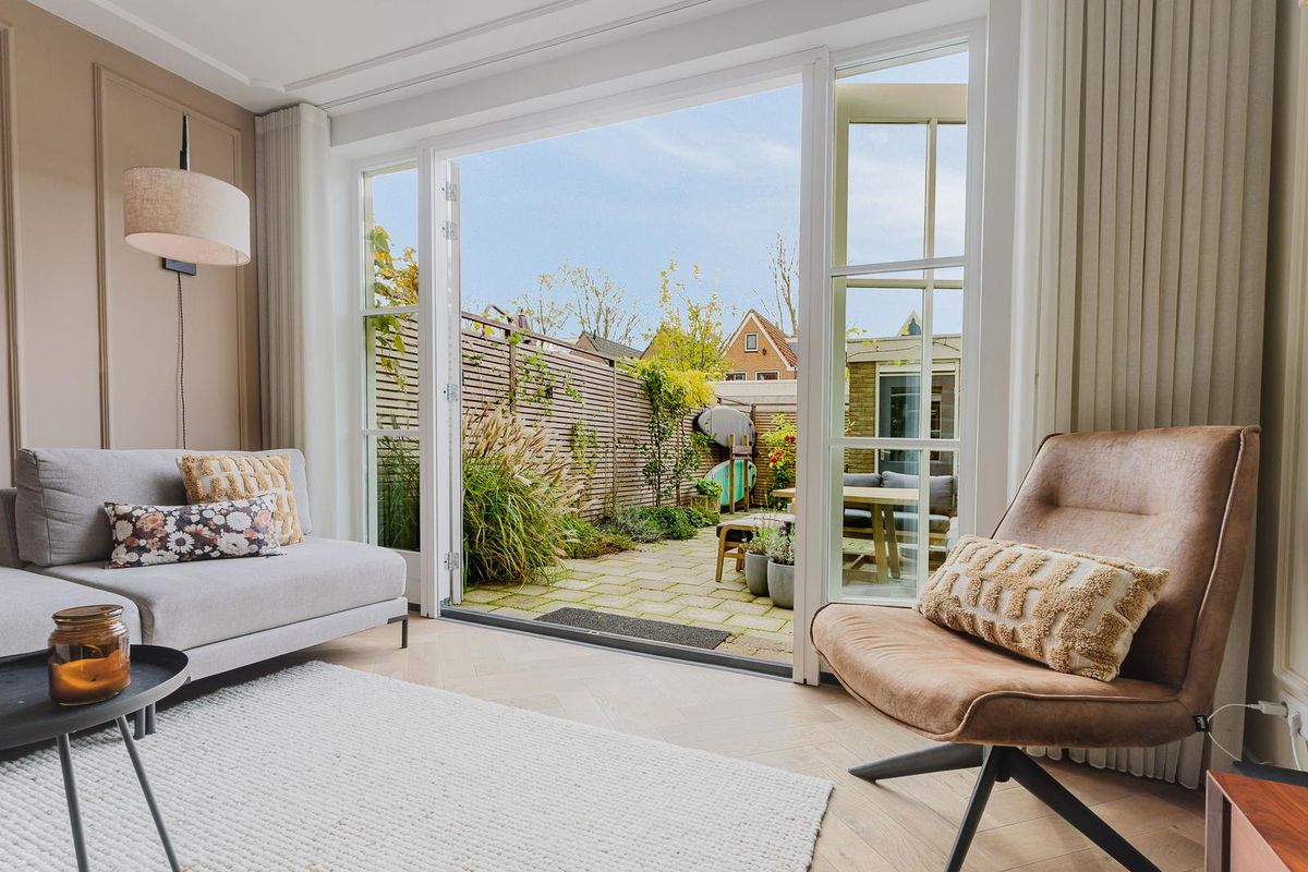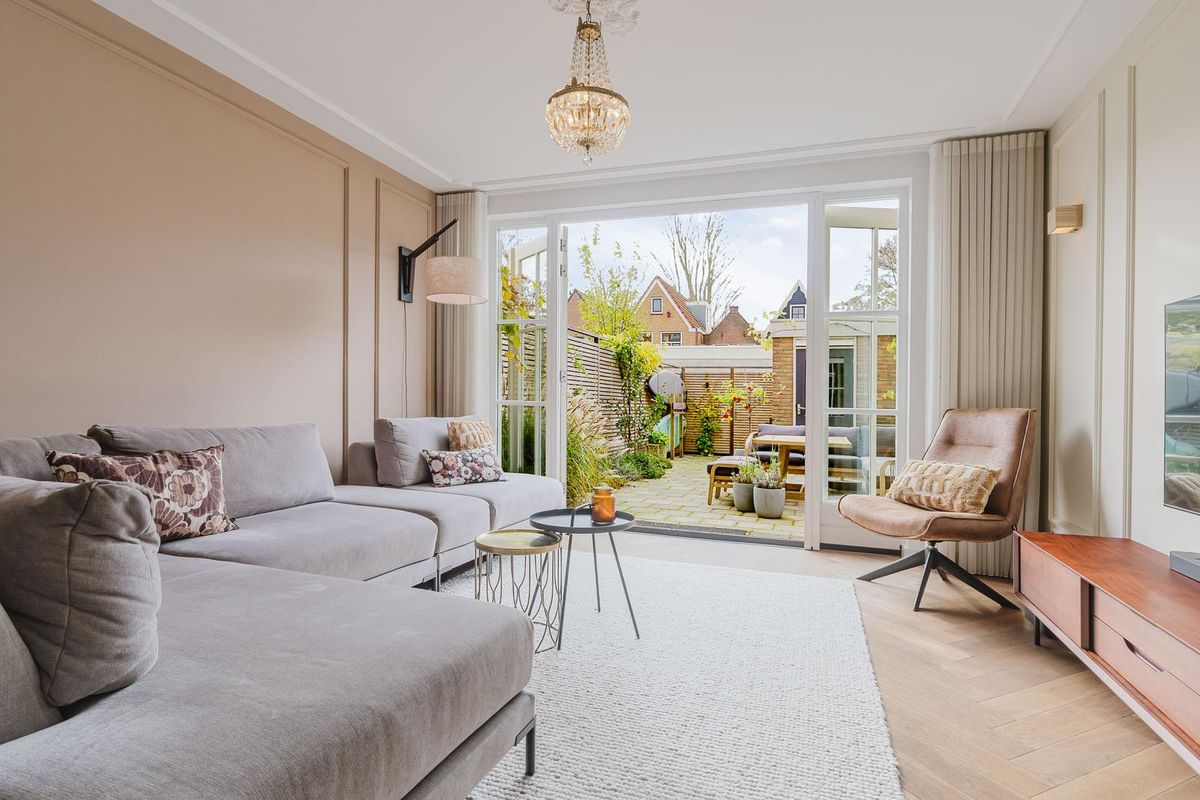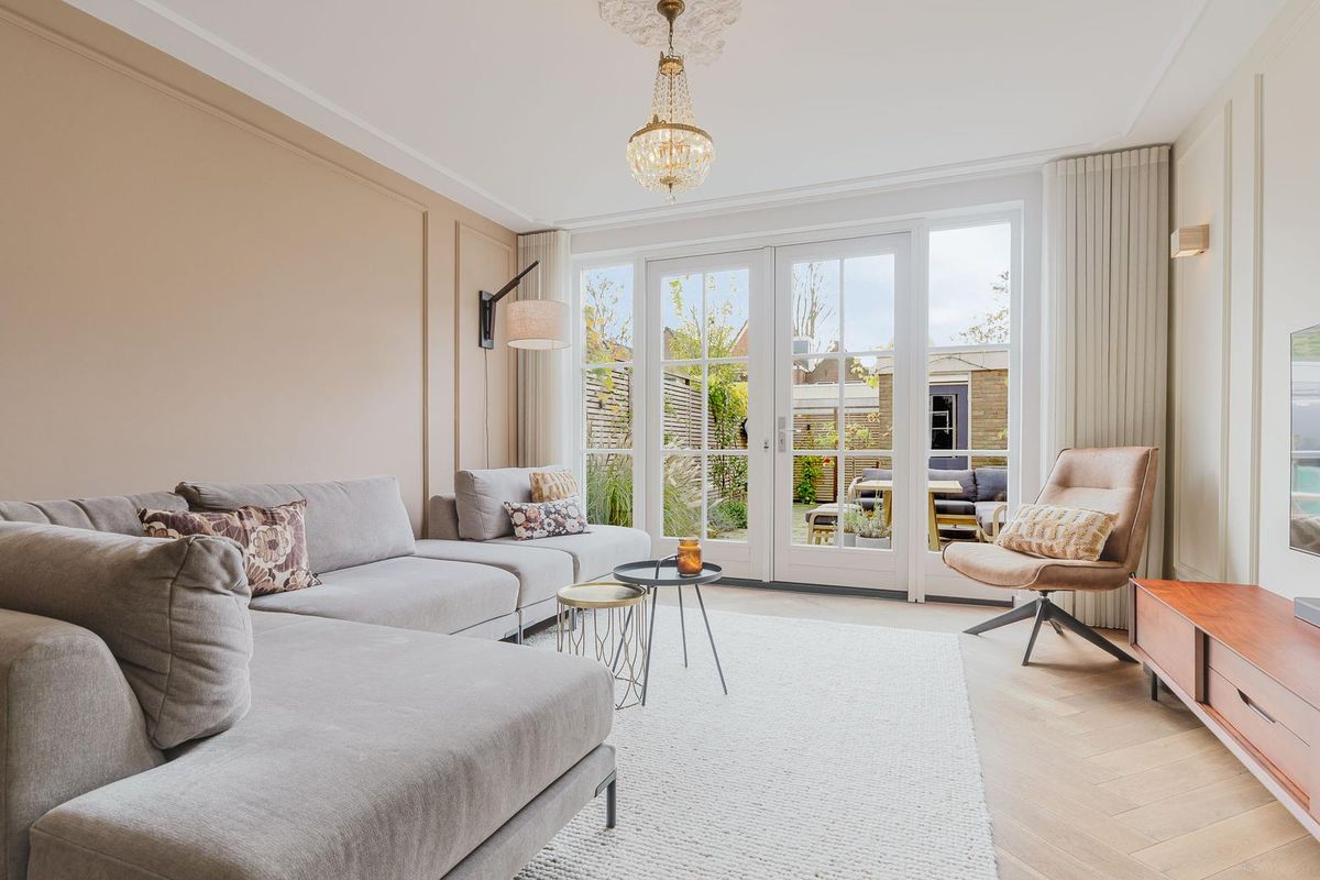 De woonkamer is licht en ruim, dankzij de vernieuwde achterpui met openslaande deuren naar de tuin. Hier geniet je van een fijne zithoek en een royale eethoek met ruimte voor lange avonden tafelen.