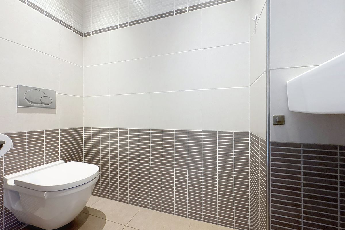 De eigen opgang op de begane grond leidt tot een gastvrije hal, waar jassen en persoonlijke spullen kunnen worden opgehangen. Deze praktische ingang creëert een gevoel van welkom.