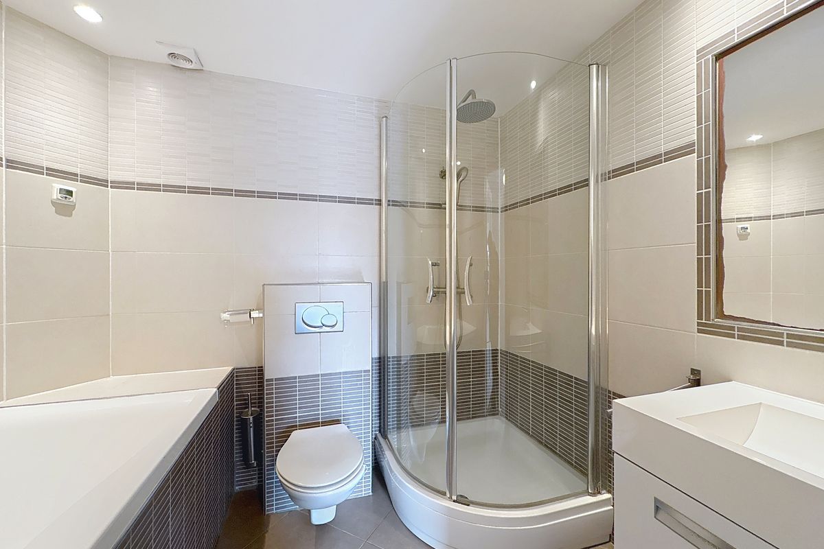 On the first floor, you’ll find several rooms. The brand new kitchen is equipped with built-in appliances such as a dishwasher, refrigerator, oven, and gas cooktop. The kitchen also provides direct access to the sunny roof terrace, an ideal spot to enjoy relaxing outdoor moments.