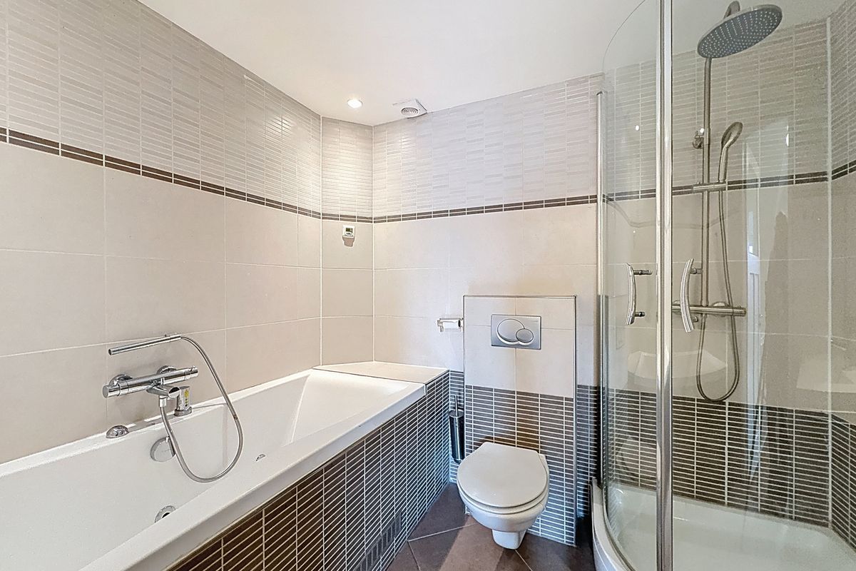 Tweede verdieping: De trap leidt naar de tweede verdieping, waar twee goed geproportioneerde slaapkamers en een ruime badkamer te vinden zijn. De badkamer is uitgerust met een ligbad, douche, toilet en wastafelmeubel.