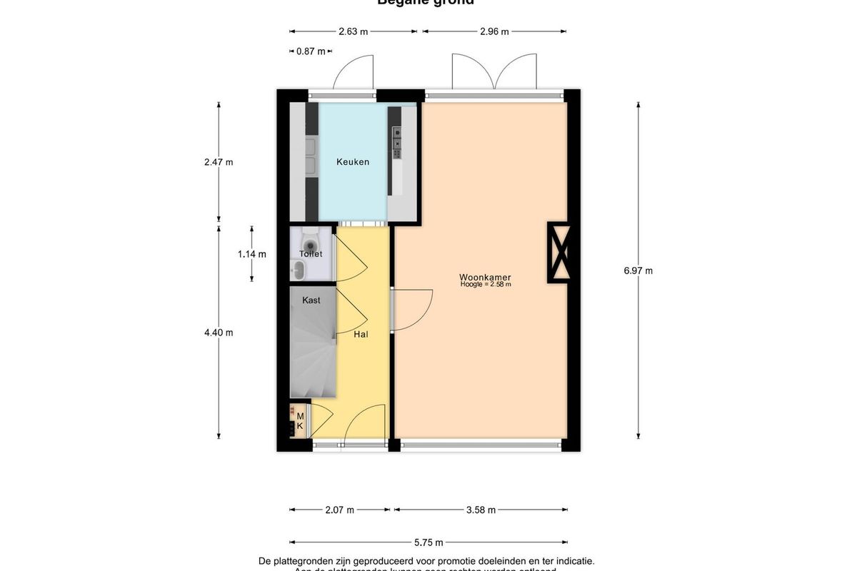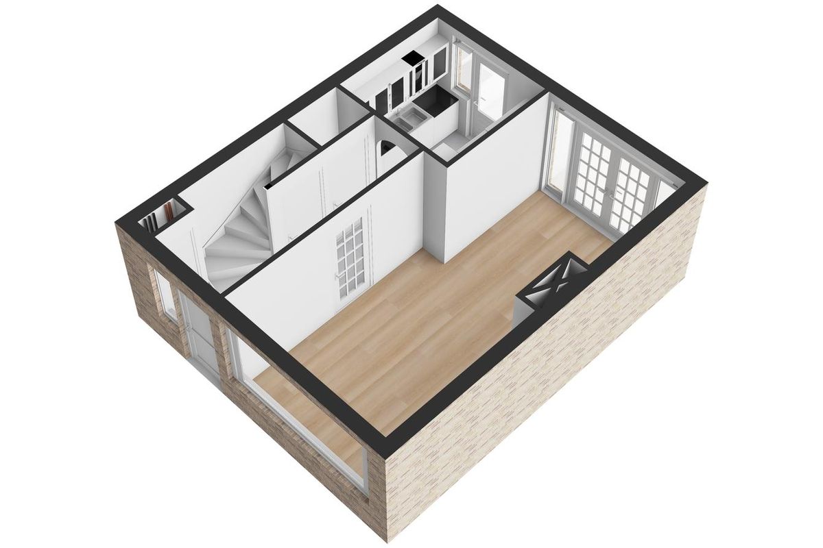 Begane grond: Entree/hal met meterkast, voorzien van 4 groepen. Aan het einde van de hal, onder de trap, bevindt zich het separate toilet met fonteintje. De hal geeft via een gemetselde boog toegang tot de keuken, voorzien van een defecte koelkast, een 4-pits gaskookplaat en een mini-vaatwasser die eveneens defect is. De woonkamer heeft veel lichtinval, met aan de achterzijde openslaande deuren naar de achtertuin en aan de voorzijde uitzicht op de straat.