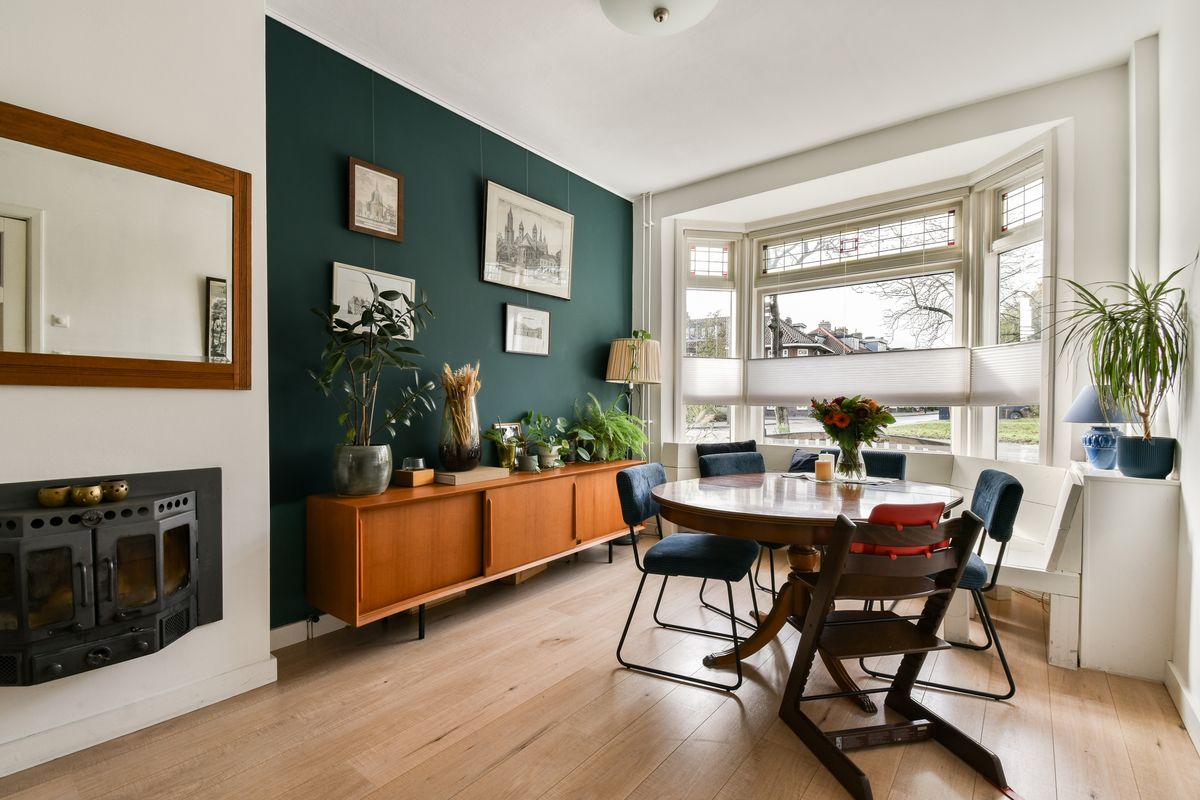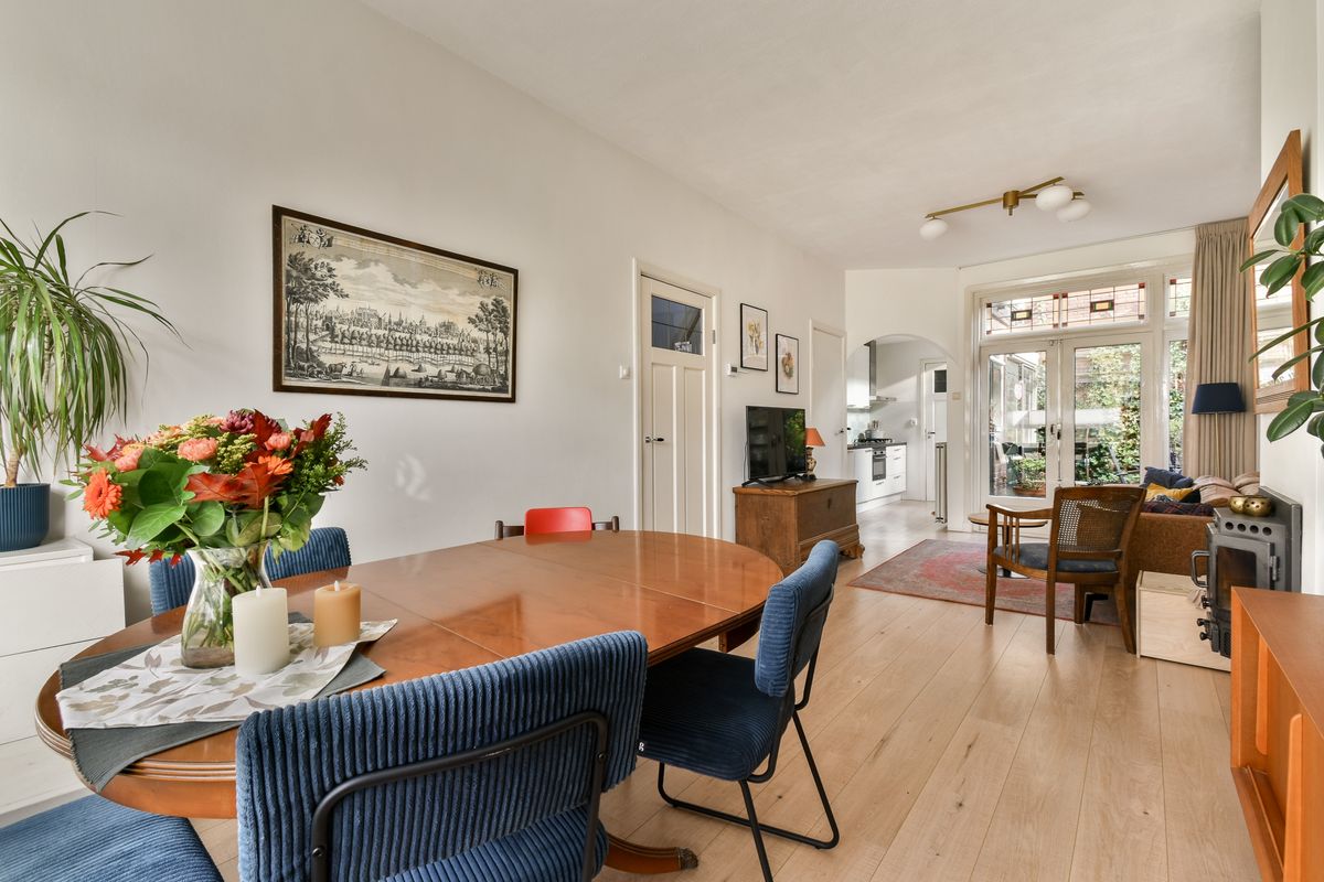 De woonkamer is een heerlijke plek om te ontspannen. De erker aan de voorzijde zorgt voor een mooie lichtinval en geeft de ruimte extra charme. De glas-in-lood raampjes en de houtkachel maken het plaatje compleet — ideaal voor warme, knusse avonden. Dankzij de openslaande deuren naar de achtertuin loopt de ruimte prachtig door naar buiten. Een handige trapkast biedt extra bergruimte, zonder dat dit ten koste gaat van het woongenot.