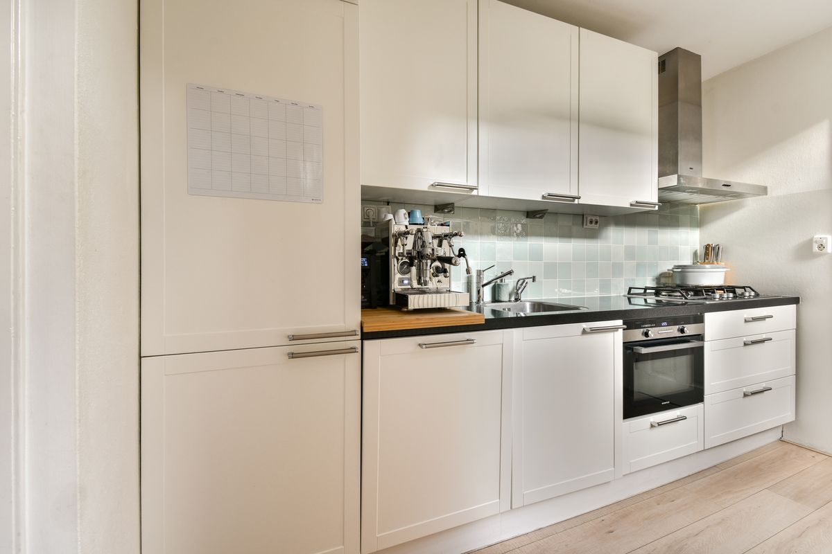 In de uitbouw bevindt zich de complete keuken, voorzien van alle apparatuur die je kunt wensen: koel-vriescombinatie, vaatwasser, combimagnetron, 5-pits gaskookplaat en een afzuigkap. Het raam en de deur naar de tuin zorgen voor een fijne verbinding met buiten en maken dit een prettige plek om te koken en te leven. Achter de keuken vind je de toiletruimte.