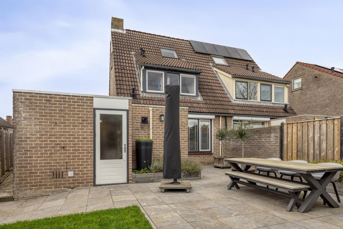 De achtertuin is met zorg aangelegd en ligt op het oosten, waardoor je ’s ochtends direct kunt genieten van de eerste zonnestralen. Het terras nodigt uit tot gezellig buiten eten of ontspannen in het weekend, terwijl het gazon zorgt voor een groene, frisse uitstraling. Achterin de tuin staat een berging met een prachtige overkapping, die afsluitbaar is met een glazen wand – ideaal voor lange zomeravonden of knusse herfstdagen.