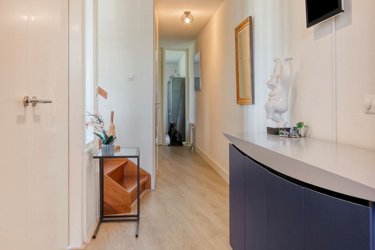 De afwerking van de woning is modern en neutraal, met lichte wanden en een warme vloer die zorgt voor een rustige basis.