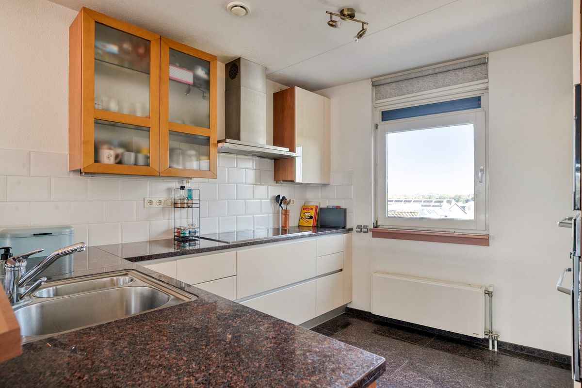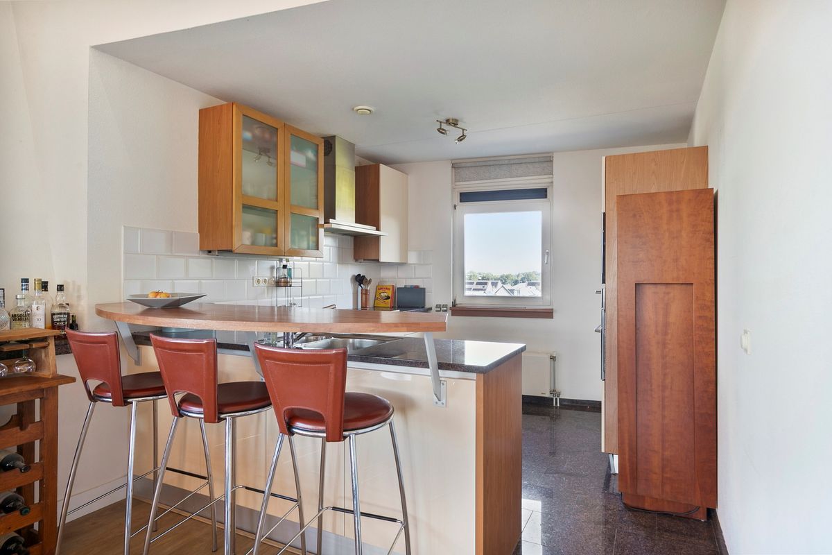 Zodra u de woning binnenstapt, ervaart u de ruimte. De royale entree met garderobe leidt u via dubbele openslaande deuren naar de indrukwekkende living, waar de 12 grote ramen direct de aandacht trekken. Het daglicht stroomt rijkelijk naar binnen via de brede raampartijen langs de hele lengte van de woonkamer. De zithoek is sfeervol en comfortabel, terwijl de open eethoek in directe verbinding staat met de keuken – ideaal voor lange diners of gezellige borrels. De keuken is uitgevoerd met granieten werkbladen en hoogwaardige apparatuur, zoals een inductiekookplaat, afzuigkap, vaatwasser, combi-oven, koffiemachine en koelkast. Vanuit de keuken heeft u zicht over de woonkamer en via het balkon de Utrechtse Heuvelrug, wat de open structuur van dit penthouse extra benadrukt.