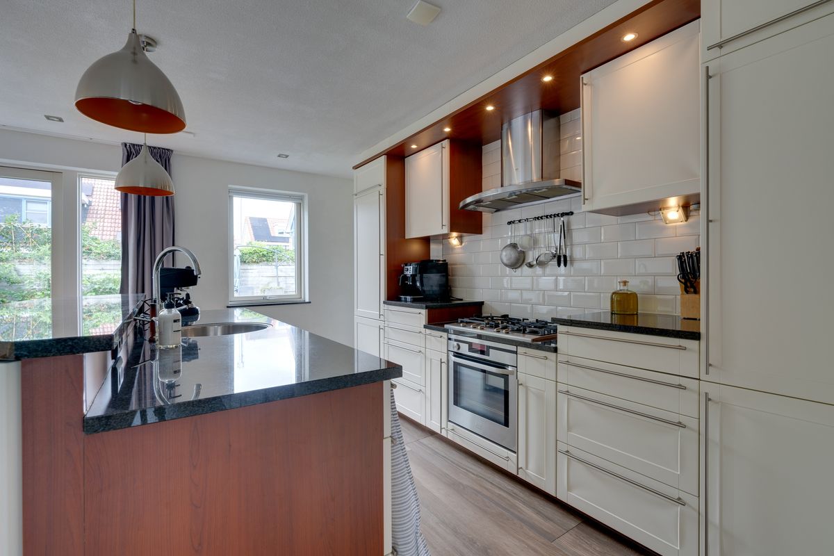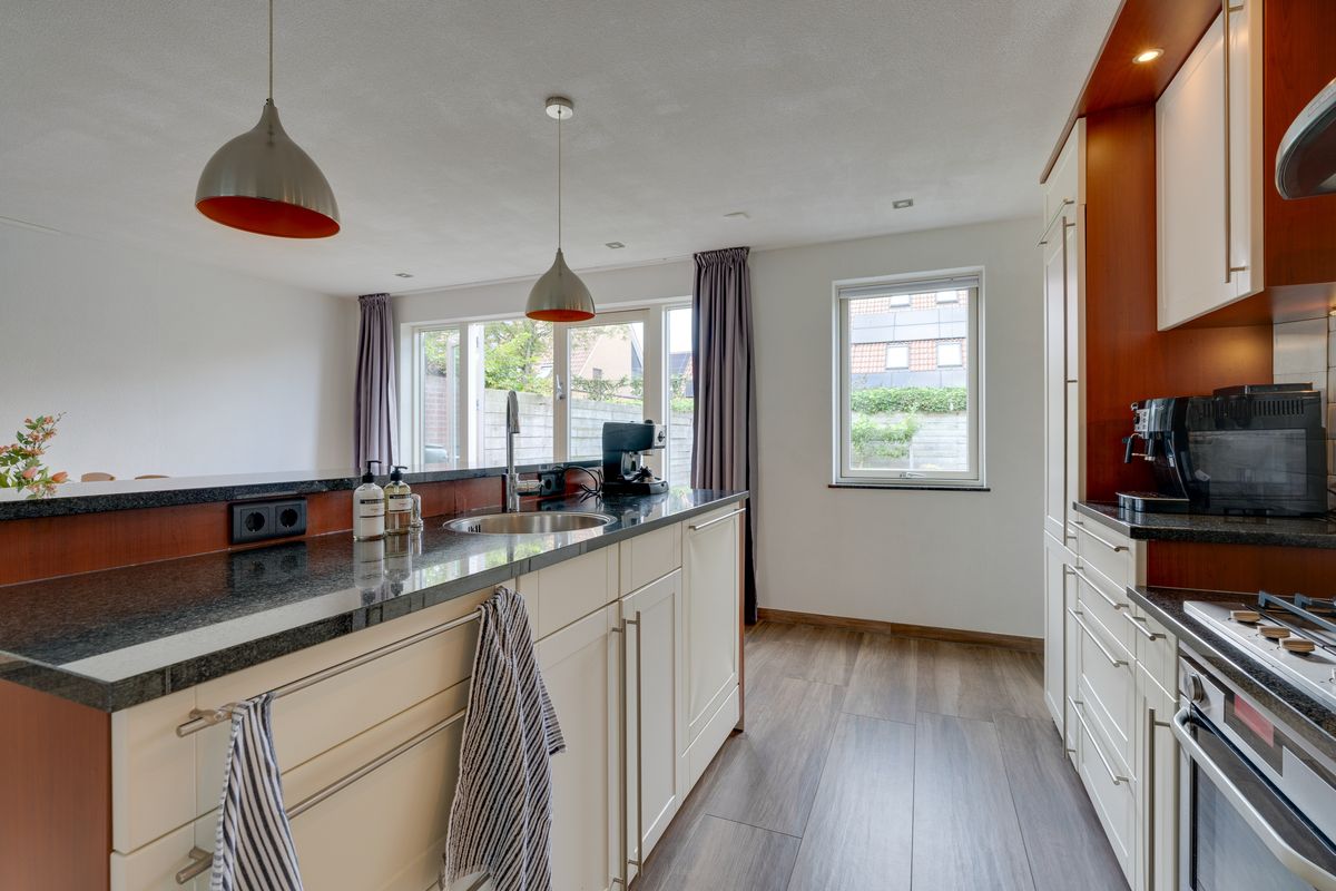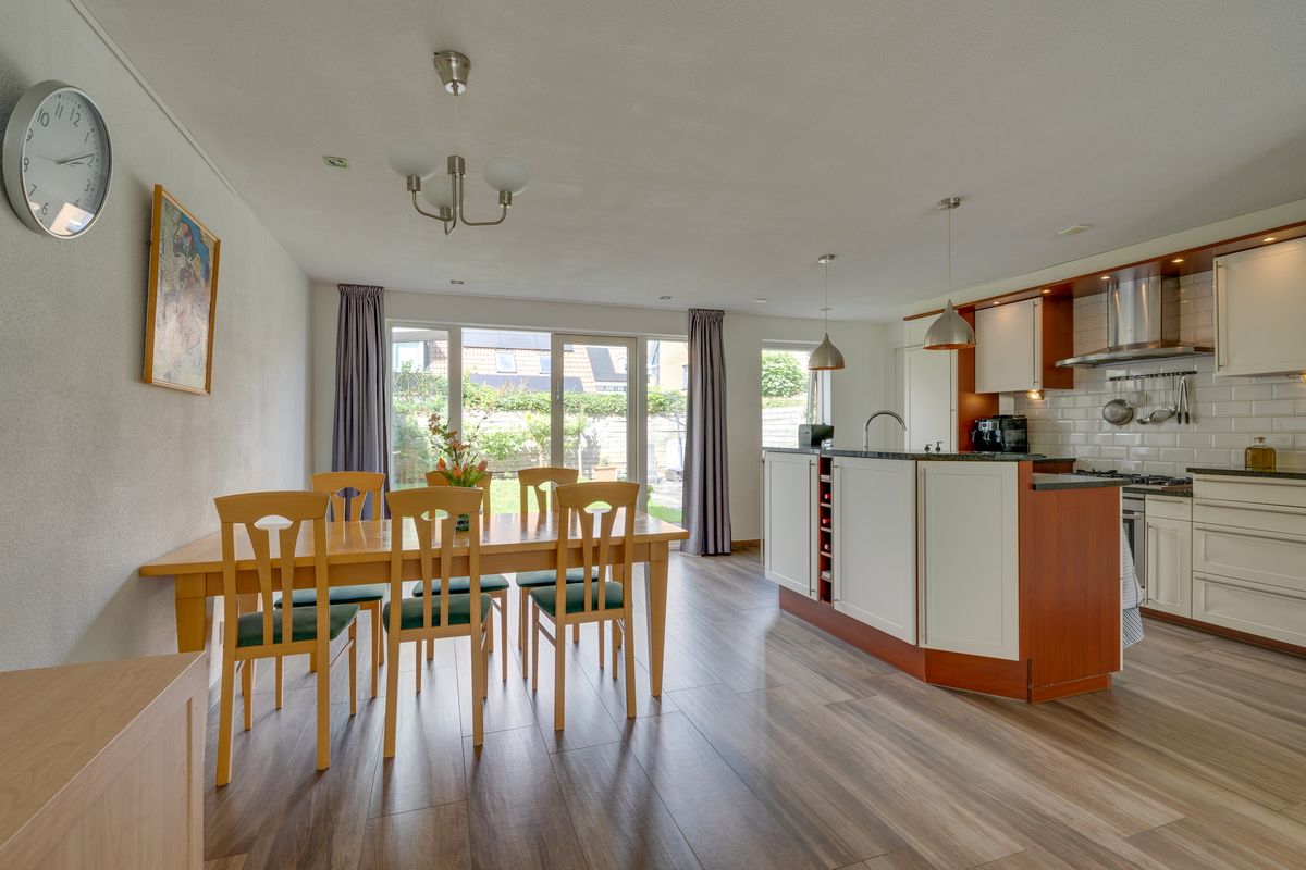 Bij binnenkomst valt direct de ruime en lichte woonkamer op. Dankzij de grote raampartijen met erker komt er volop daglicht naar binnen, wat zorgt voor een prettige en warme sfeer. De woonkamer met keramische vloer met vloerverwarming biedt genoeg ruimte voor zowel een gezellige zithoek als een royale eethoek. Aangrenzend bevindt zich de open keuken, die uitzicht geeft op de tuin. De keuken met eiland beschikt over verschillende inbouwapparatuur, te weten een vaatwasser, gaskookplaat met afzuigkap, oven, koelkast en vriezer. Dit alles afgewerkt met een natuurstenen blad. Naast de keuken is de bijkeuken geplaatst. Er is hier ruimte voor een wasmachine en droger en voldoende bergruimte.
