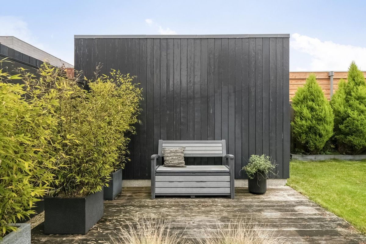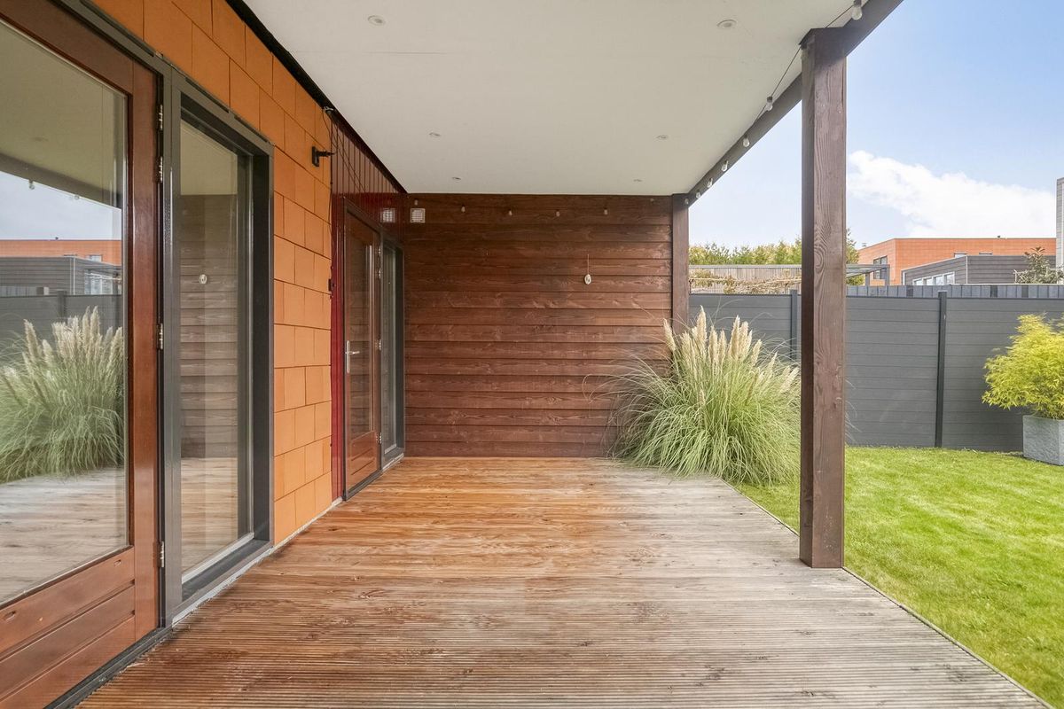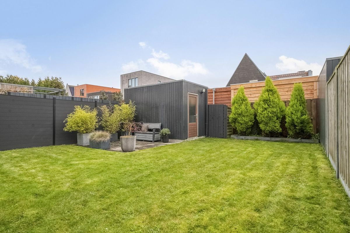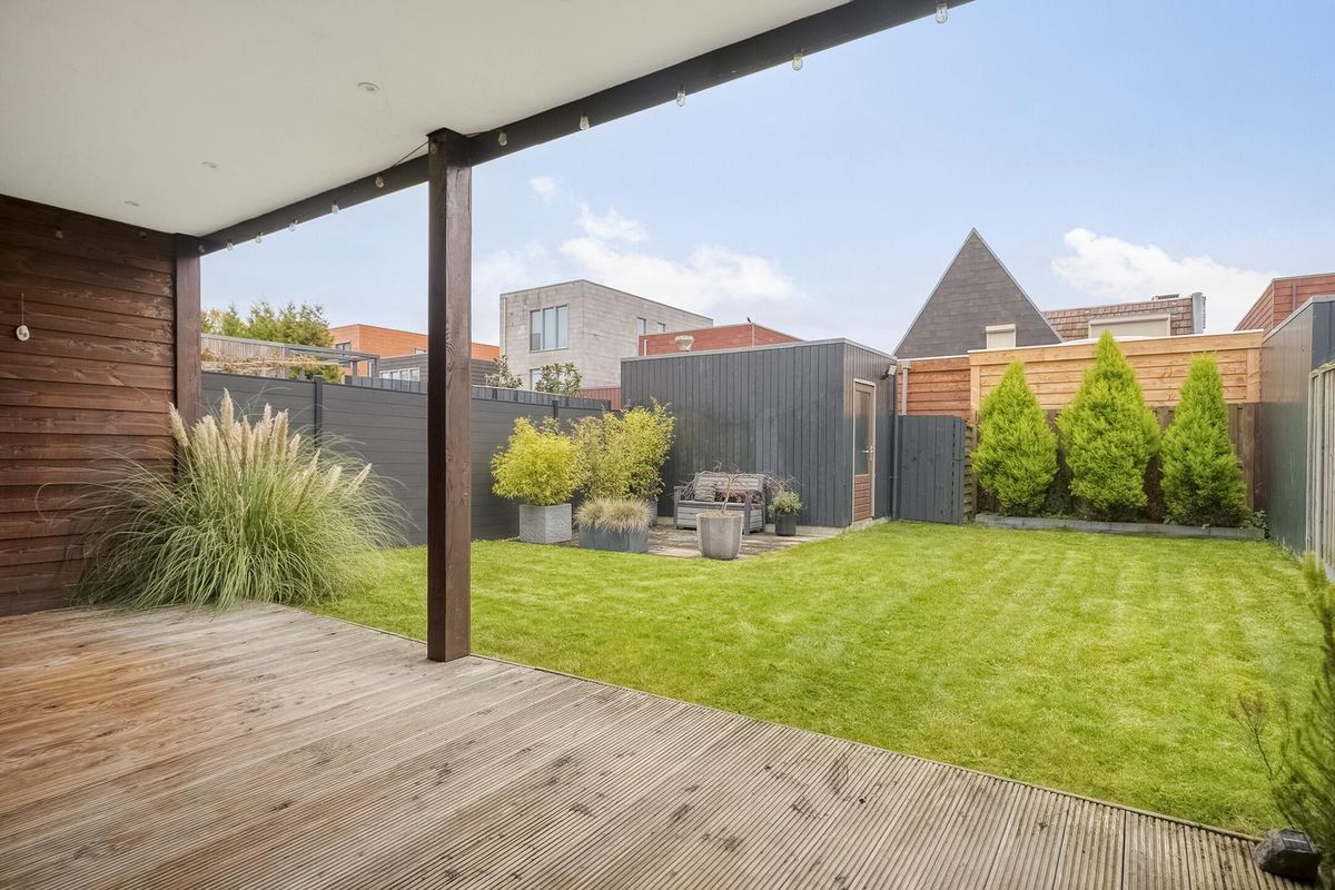- Diepe tuin van 13 meter gelegen op het oosten met overkapt loungegedeelte en vrijstaande houten berging