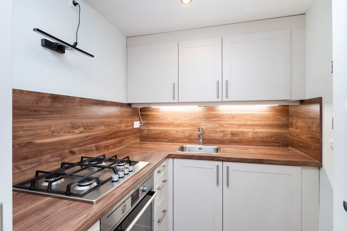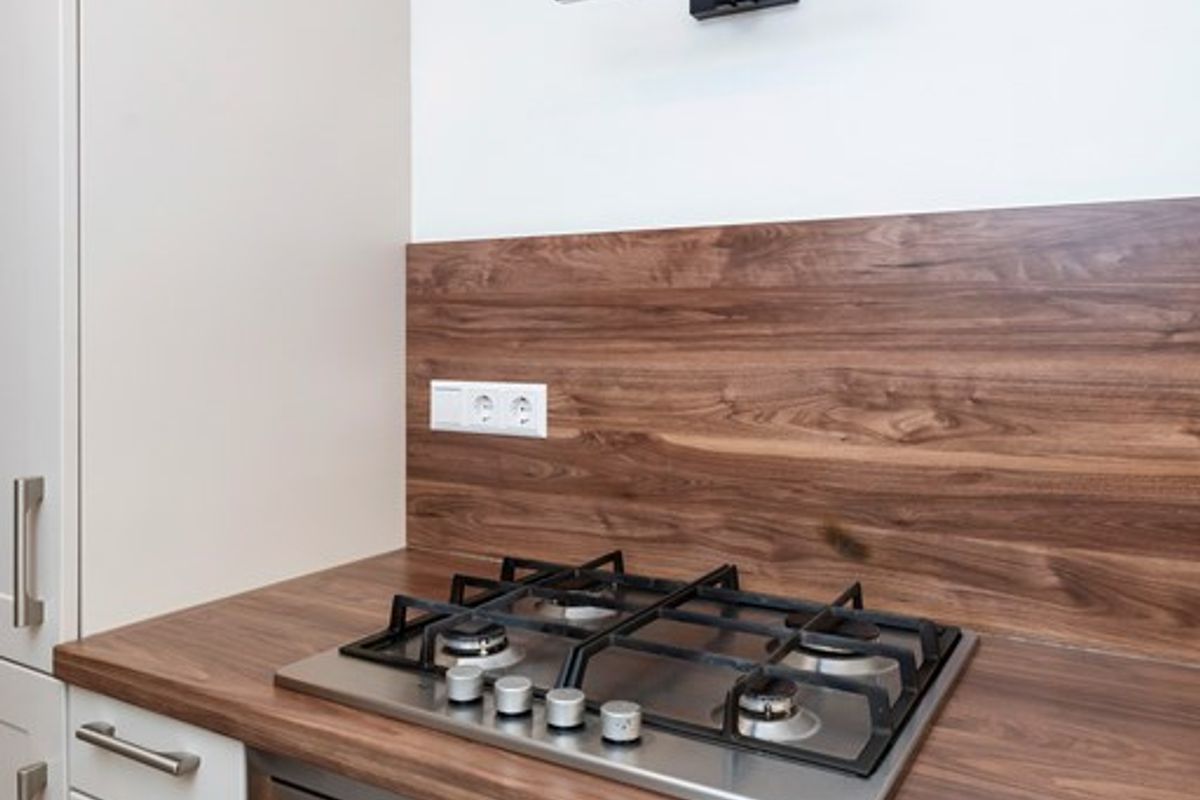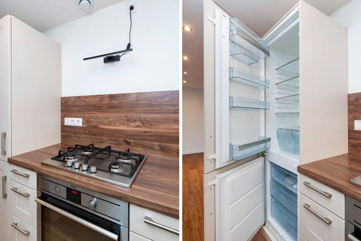 De open keuken is geplaatst in een praktische hoekopstelling en voorzien van diverse inbouwapparatuur. Handig is ook de extra bergkast met daarin de Cv-installatie (Bosch HRE, 2010) én een aparte berging in de woonkamer voor extra opslag.