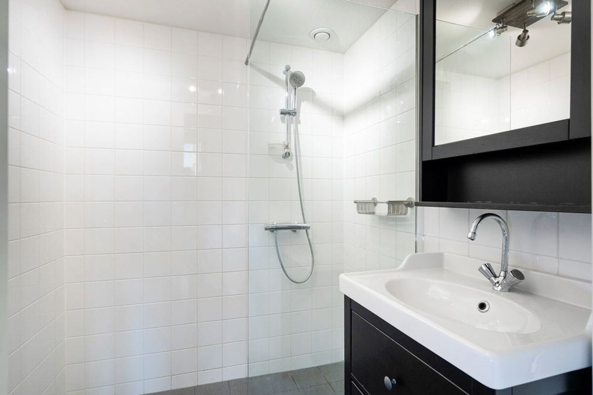 De slaapkamer (ca. 9 m²) is van goed formaat en heeft eveneens een deur naar de voortuin – ideaal voor ventilatie of direct naar buiten stappen. Aangrenzend vindt u de verzorgde badkamer, licht betegeld en voorzien van een douchehoek, wastafelmeubel, handdoekradiator en wasmachine-/drogeraansluiting. Achterin de slaapkamer is bovendien een verrassend ruime walk-in kast bereikbaar. Met daarin ook een aansluiting wasmachine/droger.