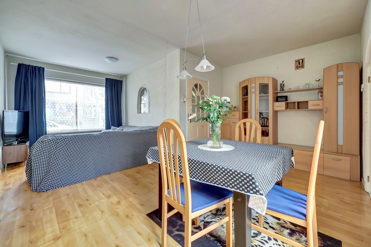 In de woonkamer is voldoende ruimte voor zowel een eethoek als een zithoek. De schuifpui aan de achterzijde is een echte meerwaarde: deze zorgt voor veel natuurlijk licht en creëert in de zomer een prachtige open verbinding met de tuin.