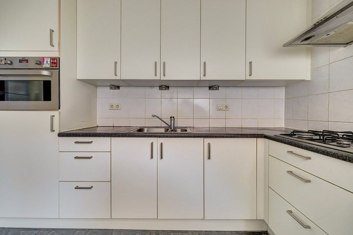 Via een deur bereik je de keuken in de aanbouw. Deze is uitgerust met diverse inbouwapparaten, waaronder een combimagnetron, koelkast en een 4-pits gaskookplaat.