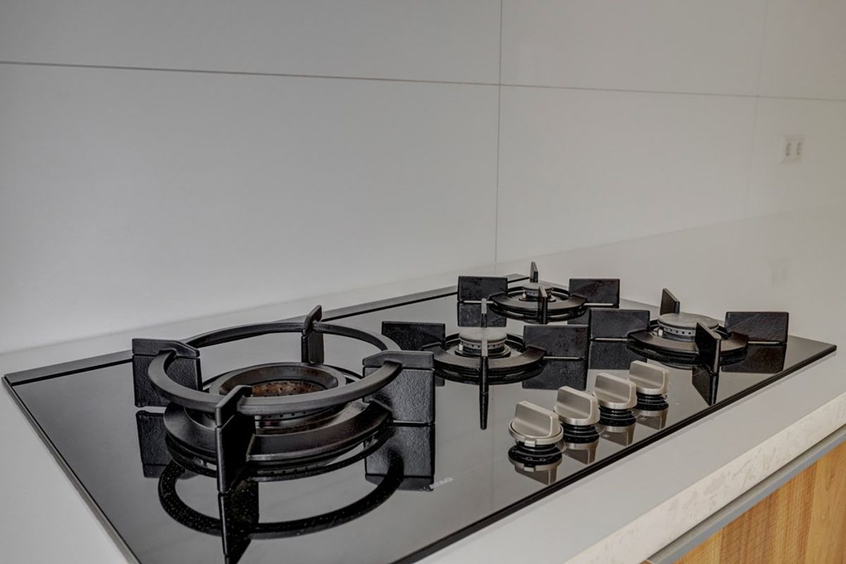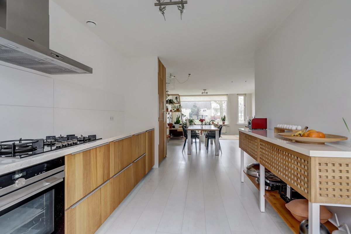 Aan de achterzijde bevindt zich de open keuken met een keukenblok in wandopstelling. Deze beschikt over diverse inbouwapparatuur zoals een gaskookplaat, afzuigkap, koelkast, vriezer, vaatwasser en een oven. Hier bevinden zich dubbele openslaande deuren met toegang naar de achtertuin.