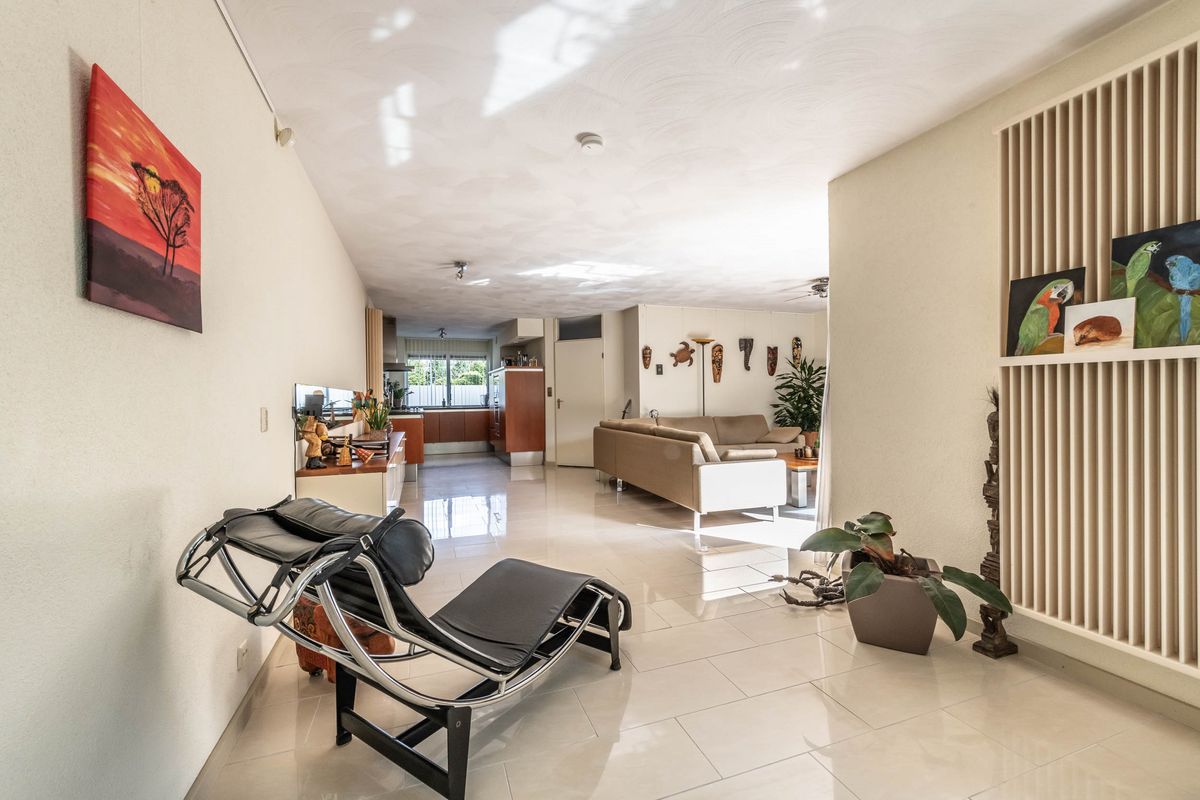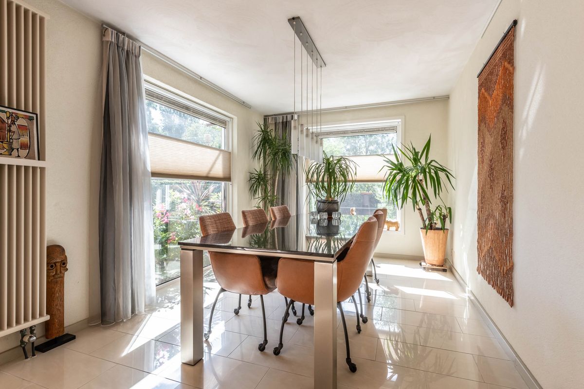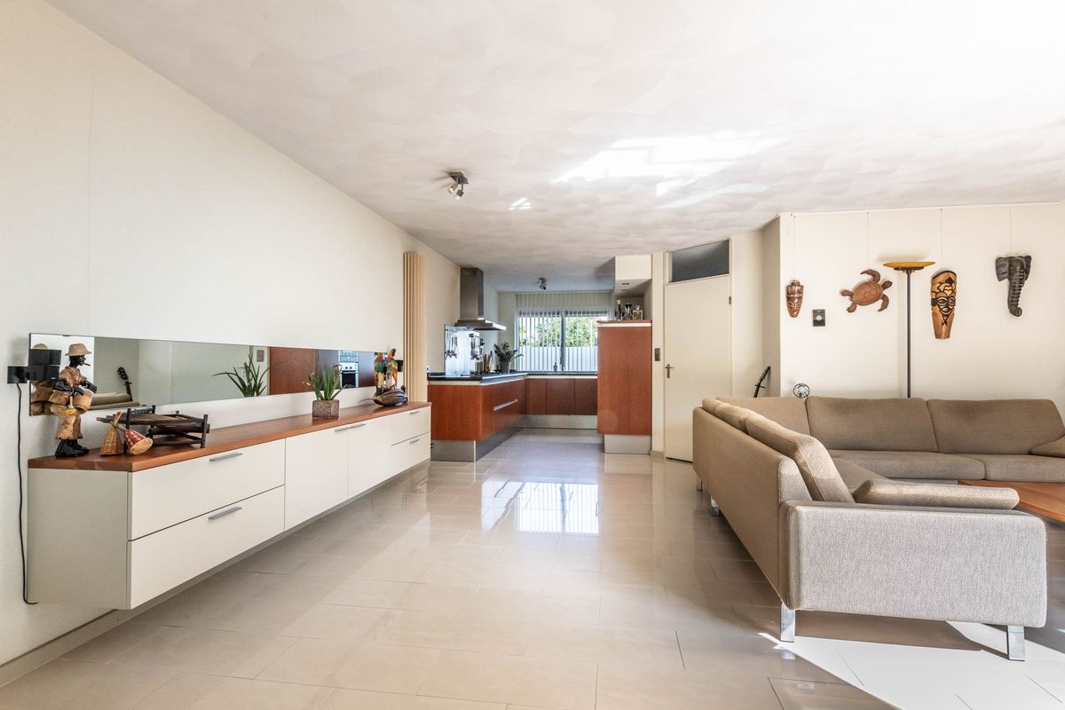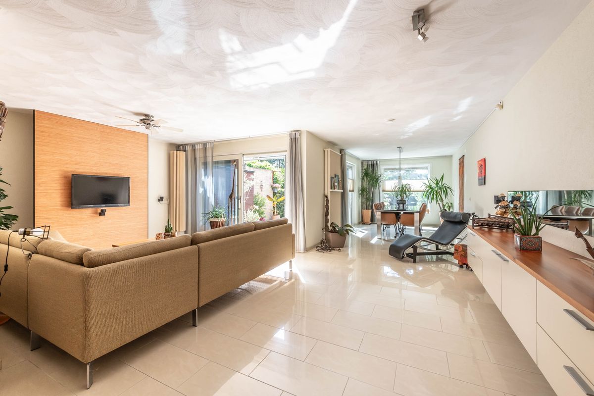 De royale living bestaat uit een woon- en eetkamer gedeelte en nodigt uit om samen te genieten; of je nu lang wilt natafelen, borrelen of heerlijk voor de tv wil zitten, het kan hier allemaal. De living is voorzien van een plavuizen vloer met vloerverwarming en design radiatoren. Dankzij de grote raampartijen en een schuifpui naar de tuin is het overdag altijd heerlijk licht.