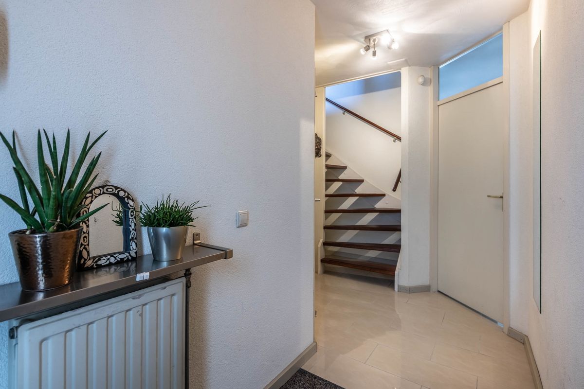 De hal is ruim en heeft een garderobe onder de trap. Vanuit de hal bereik je het toilet met fonteintje, de meterkast, de inpandige garage en de woonkamer. De fraaie hardhouten trap brengt je naar de eerste verdieping.