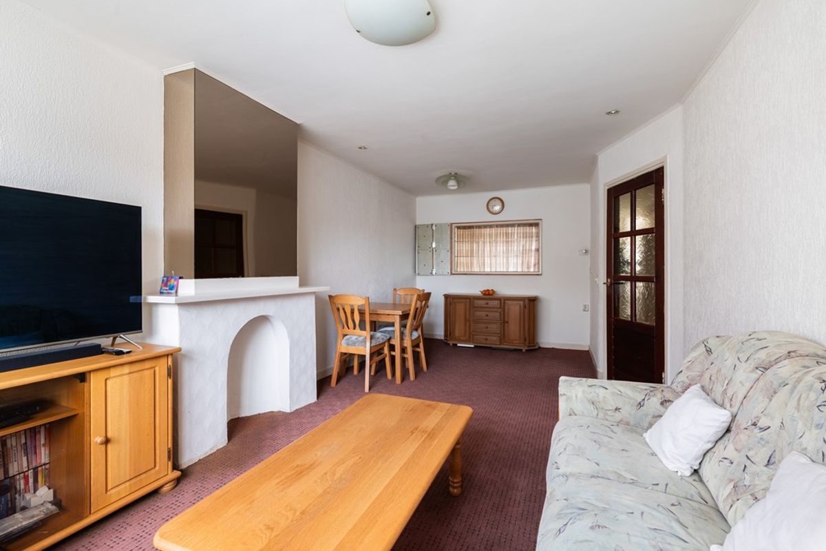 De woonkamer bevindt zich aan de voorzijde van de woning en kenmerkt zich door de grote raampartijen en de prettige lichtinval. Door de ligging aan de voorzijde heb je hier relatief weinig inkijk en geniet je van een vrij uitzicht op de groene omgeving.