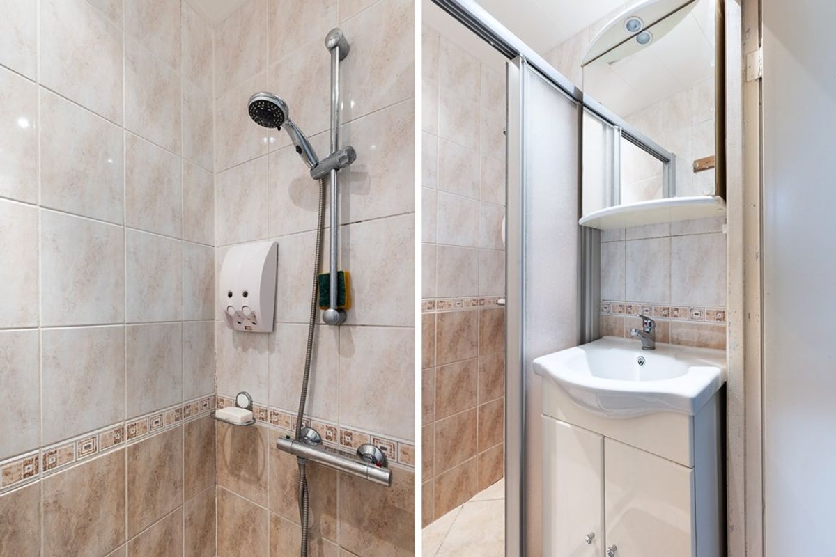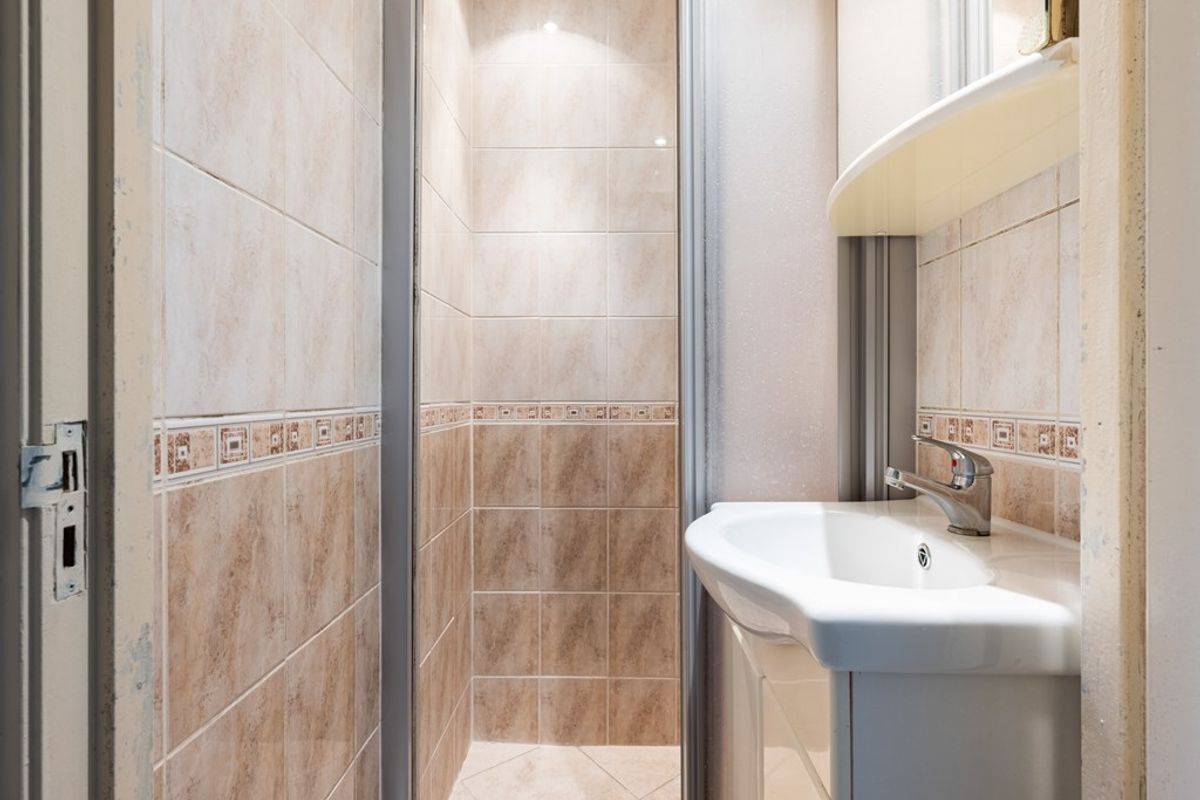 De badkamer is netjes uitgevoerd en voorzien van een douchecabine en een wastafelmeubel.