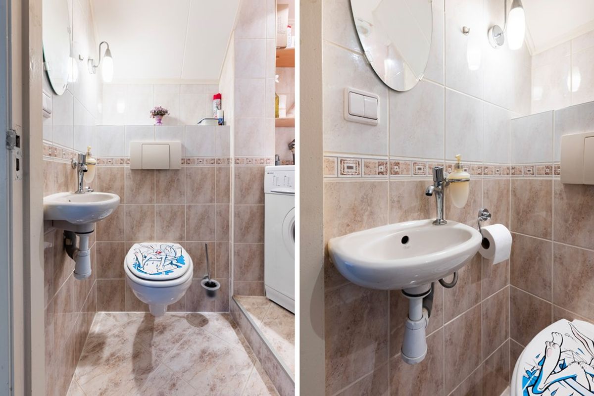 The apartment is accessed through an open staircase leading to the first floor. From the entrance hall, which includes the meter cupboard and a separate toilet, you have access to the various rooms.