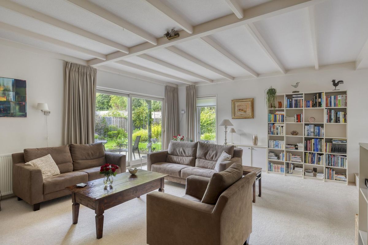 De woonkamer is een heerlijke leefruimte met aan beide zijden grote raampartijen, waardoor het daglicht rijkelijk binnenvalt.