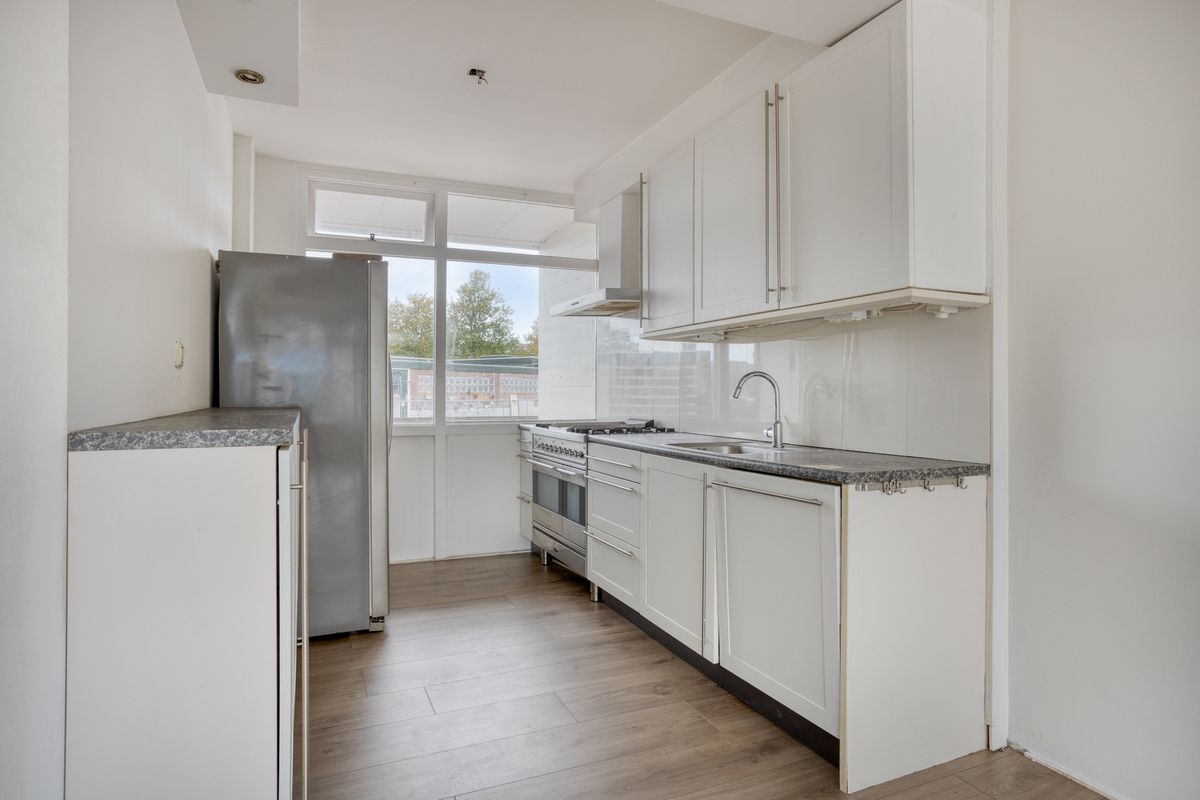 De ruime woonkamer valt direct op door de grote raampartijen die zorgen voor veel natuurlijk licht en een prettige, open sfeer. De half open keuken sluit hier naadloos op aan en biedt volop ruimte om samen te koken, te borrelen of te eten met familie en vrienden. Het appartement is een kluswoning. Momenteel moet de cv-installatie nog worden geïnstalleerd en is de badkamer niet aangesloten op het water.
