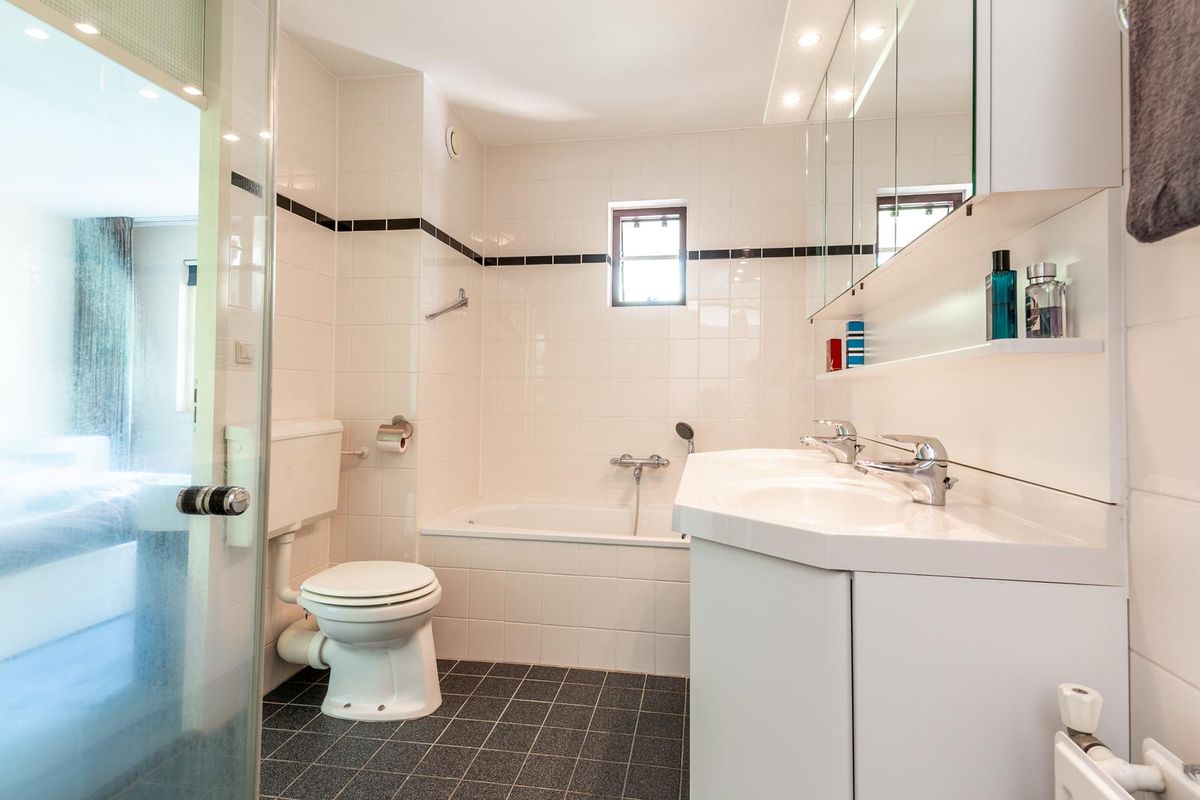 De badkamer is zowel vanuit deze slaapkamer als vanuit de overloop bereikbaar. Deze is compleet uitgerust met een ligbad, aparte douche, toilet en een breed wastafelmeubel met dubbele wasbak.