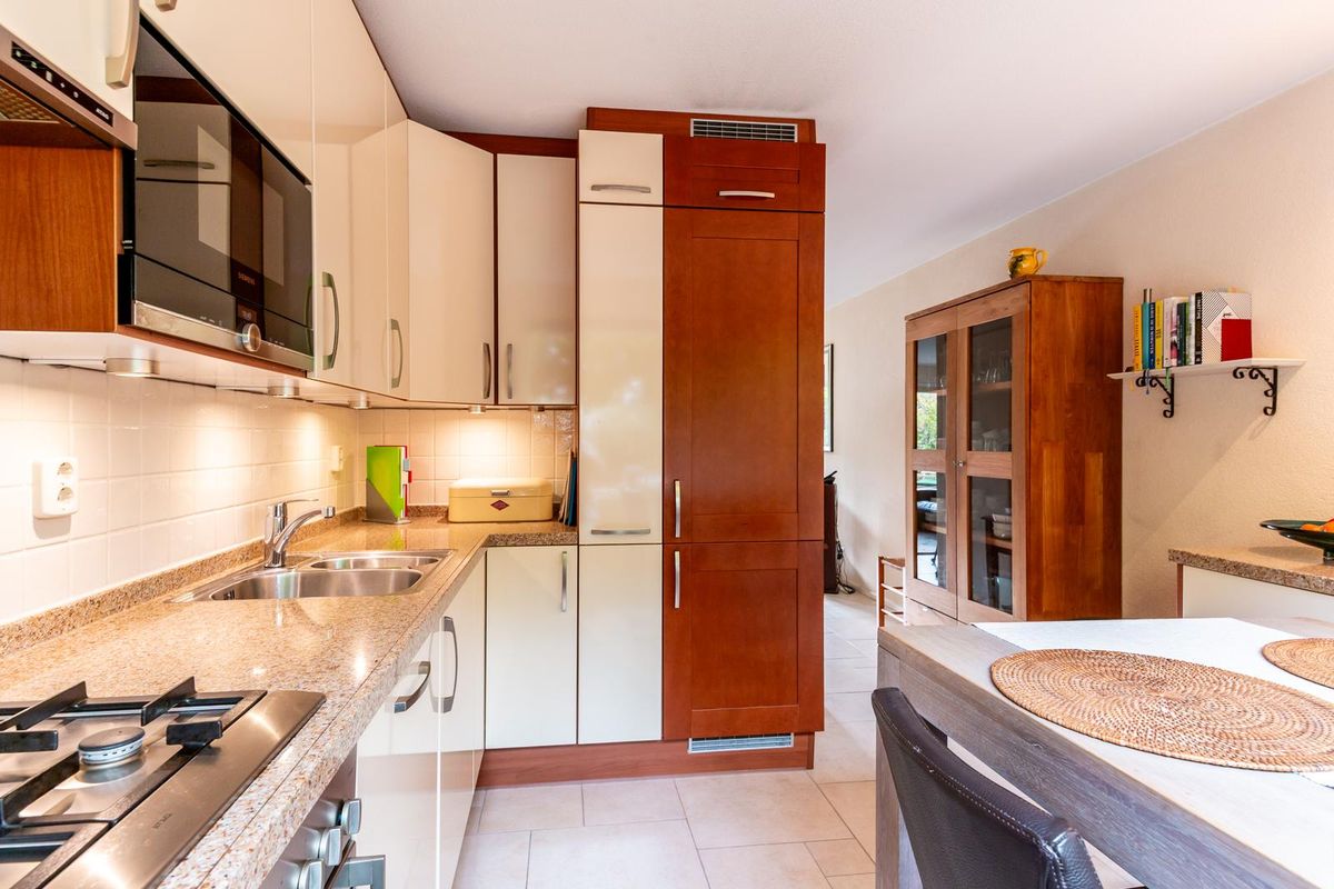 De keuken, gelegen aan de voorzijde, is eveneens ruim opgezet. Hier kun je met gemak een extra eettafel plaatsen. De meeste apparatuur is tussentijds vernieuwd, waardoor koken hier niet alleen praktisch, maar ook modern en comfortabel is.