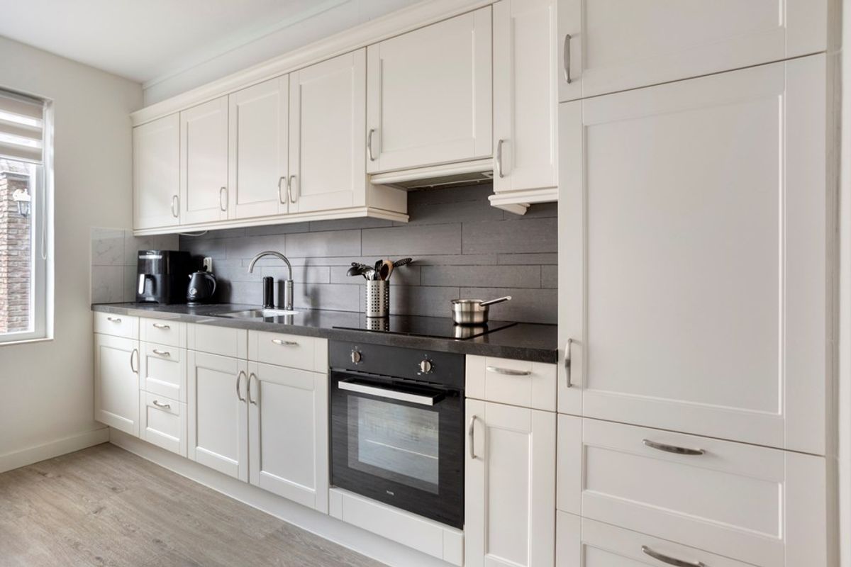 Aan de voorzijde van de woning bevindt zich de open keuken, die naadloos aansluit op de woonkamer. De langgerekte opstelling zorgt voor een praktische werkruimte, voorzien van een inductiekookplaat met afzuigkap, oven, spoelbak, ruime opbergmogelijkheden en losstaande koelkast. De keuken is netjes onderhouden en biedt voldoende plek voor een eettafel of ontbijtplek, waar u met gemak de dag begint met een kop koffie en uitzicht op de straat.