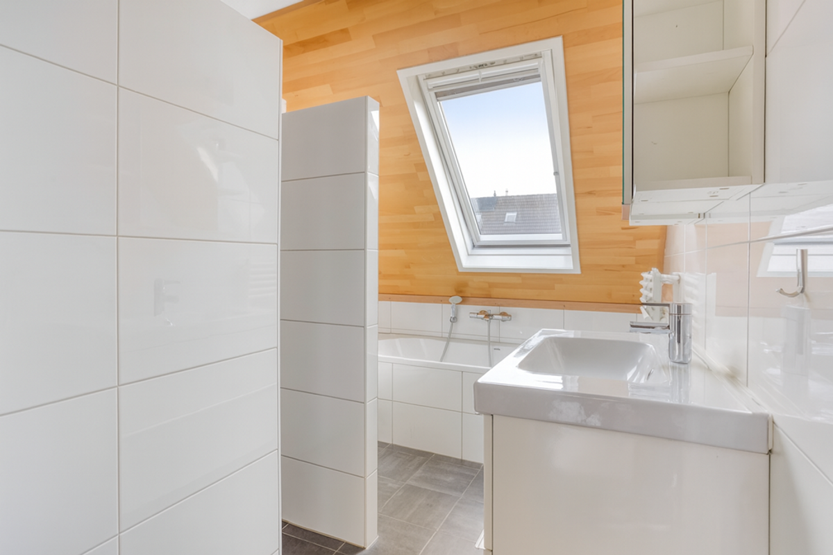 De badkamer, eveneens bereikbaar via de overloop, is volledig betegeld en voorzien van een ligbad, douche, wastafel met spiegel, een handdoekradiator en toilet.