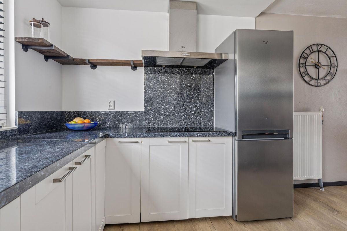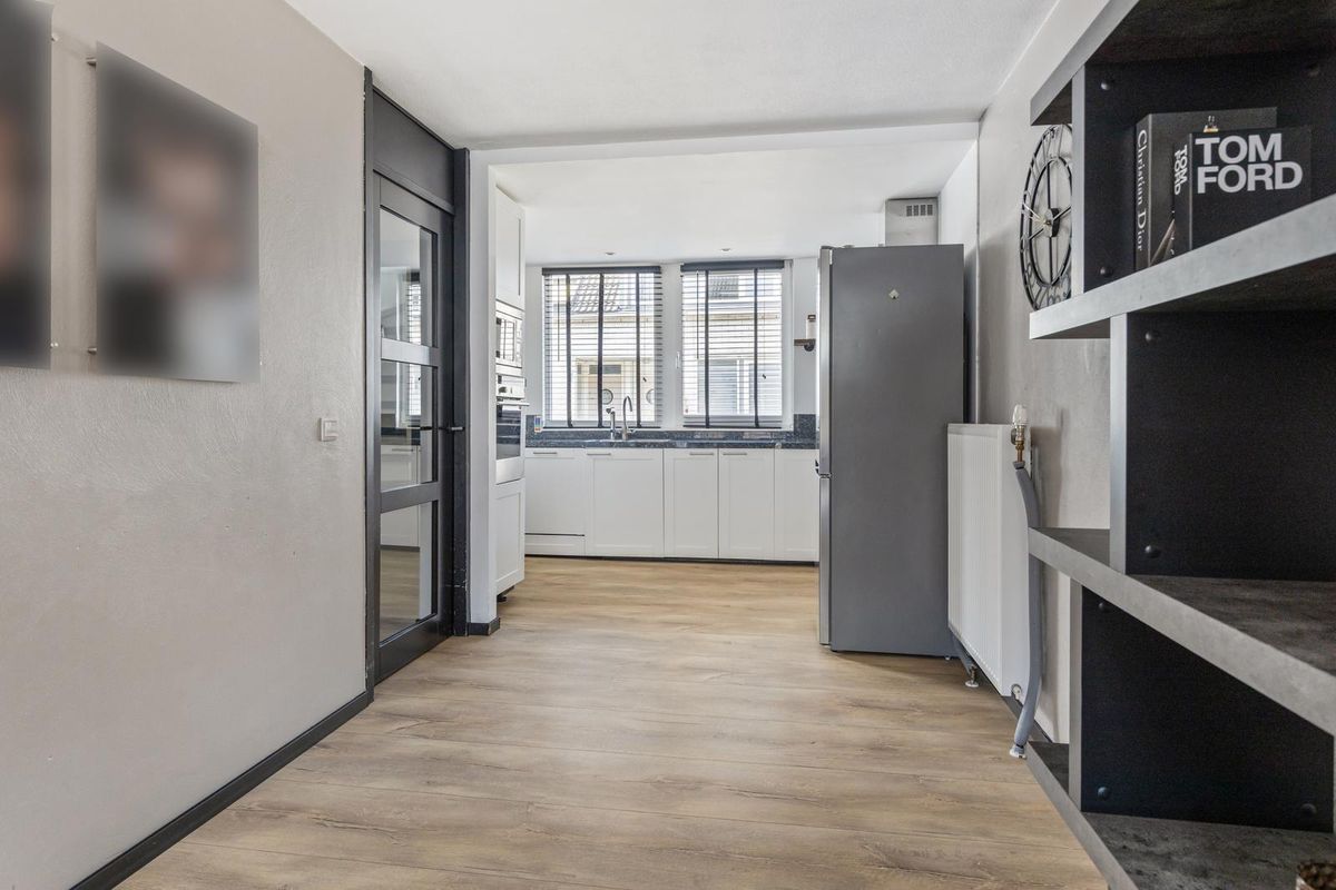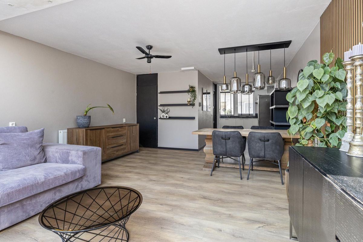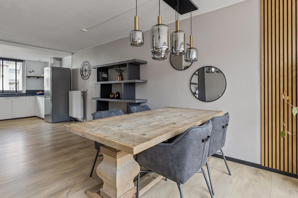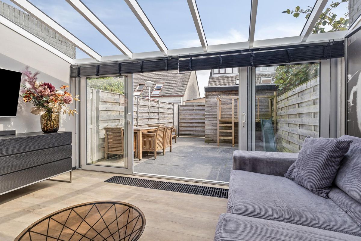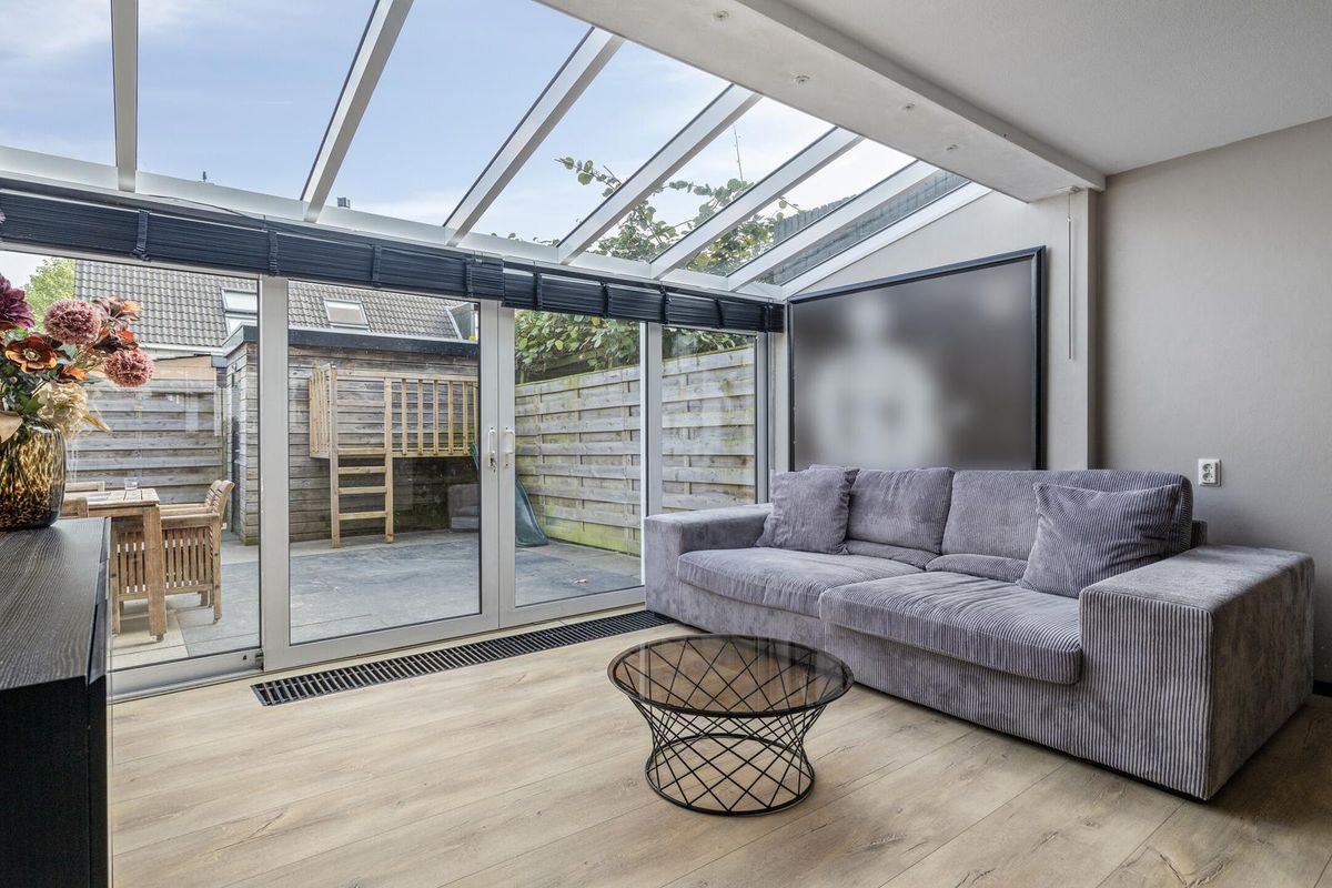 De woonkamer is aan de achterzijde flink uitgebouwd en beschikt over een lichte serre met grote schuifpuien. Dit zorgt voor een fijne verbinding met buiten en een overvloed aan daglicht. De ruimte biedt plaats voor een comfortabele zithoek en een royale eethoek.