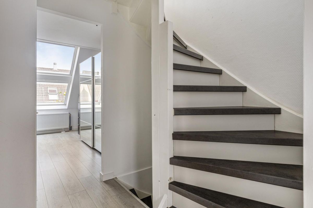 De tweede verdieping herbergt de derde slaapkamer, voorzien van een dakkapel waardoor er veel licht naar binnen valt. Daarnaast is er volop bergruimte achter de knieschotten. Op deze verdieping bevindt zich ook de aparte wasruimte met aansluiting voor wasmachine en droger.