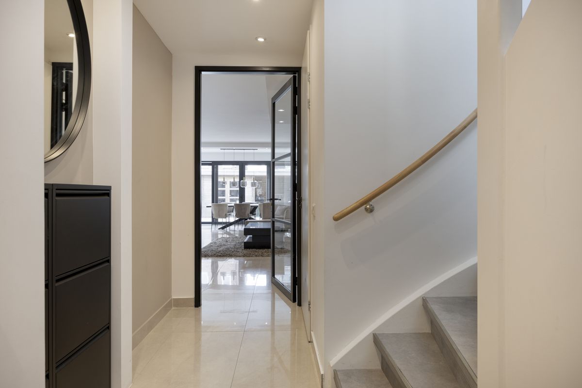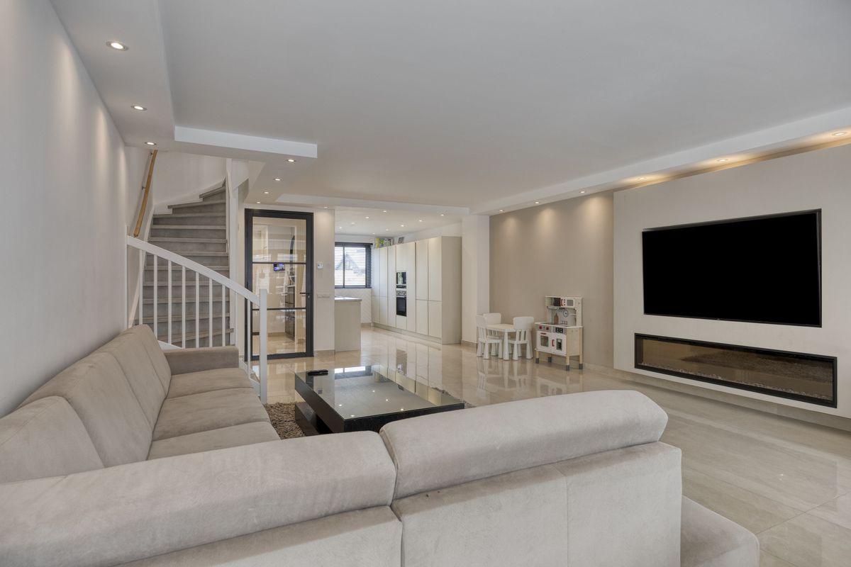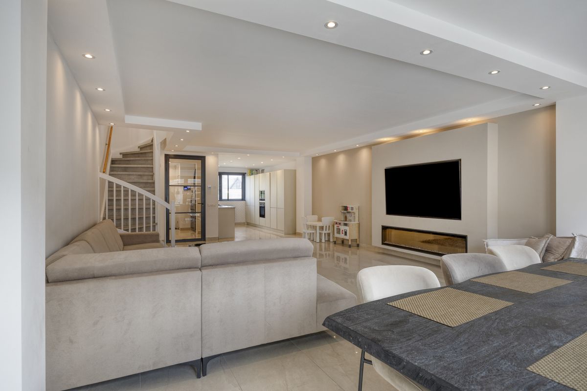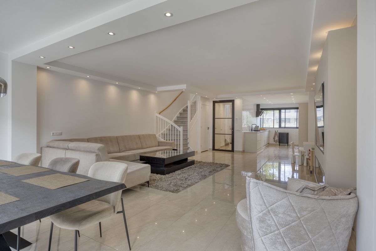 Overloop met toegang tot de ruime woonkamer met inbouwspots . Aan de voorzijde is de open keuken gelegen welke is voorzien van inbouwapparatuur. De grond is voorzien van tegels met vloerverwarming. Trapopgang naar de derde verdieping.