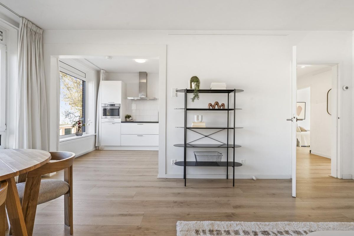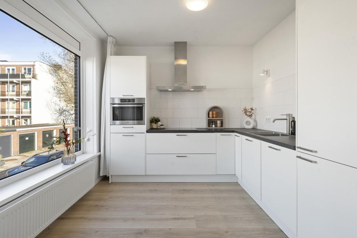 De lichte woonkamer met grote raampartijen biedt een prettige leefruimte en staat in open verbinding met de moderne hoek opgestelde keuken. De keuken is voorzien van diverse inbouwapparatuur, waaronder een vaatwasser, combi-oven, koelkast en vriezer.
