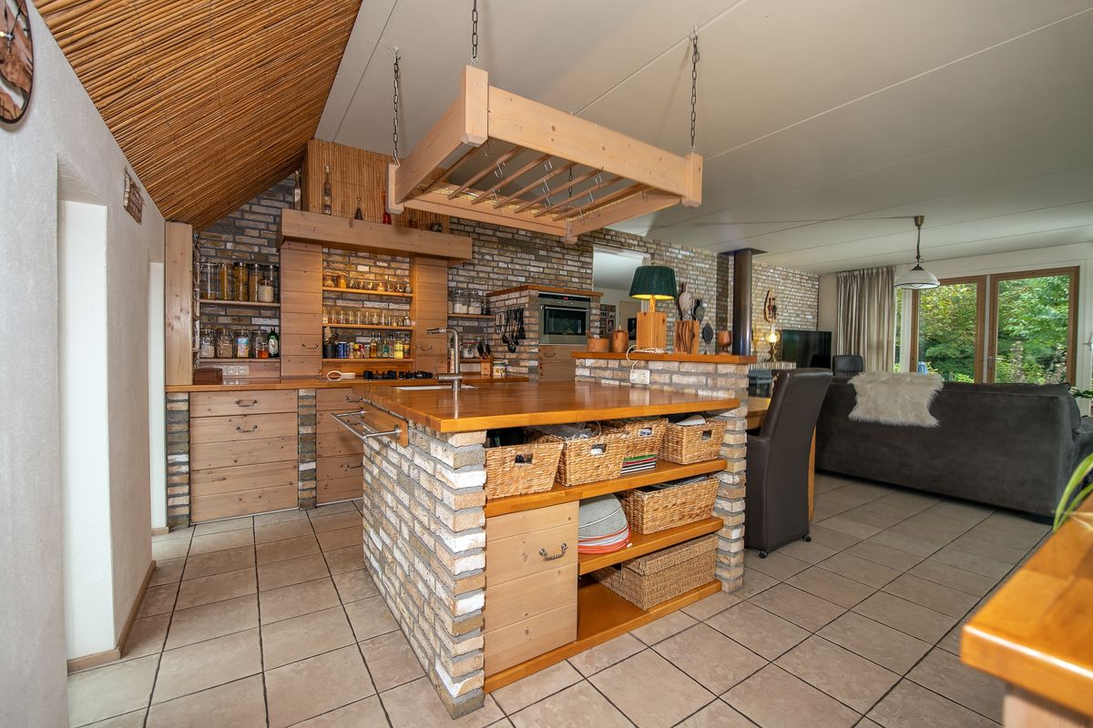 De zeer ruime woonkeuken welke is voorzien van een houten keuken met diverse inbouwapparatuur, o.a. vaatwasser (2025), koelkast, combimagnetron en afzuigunit.