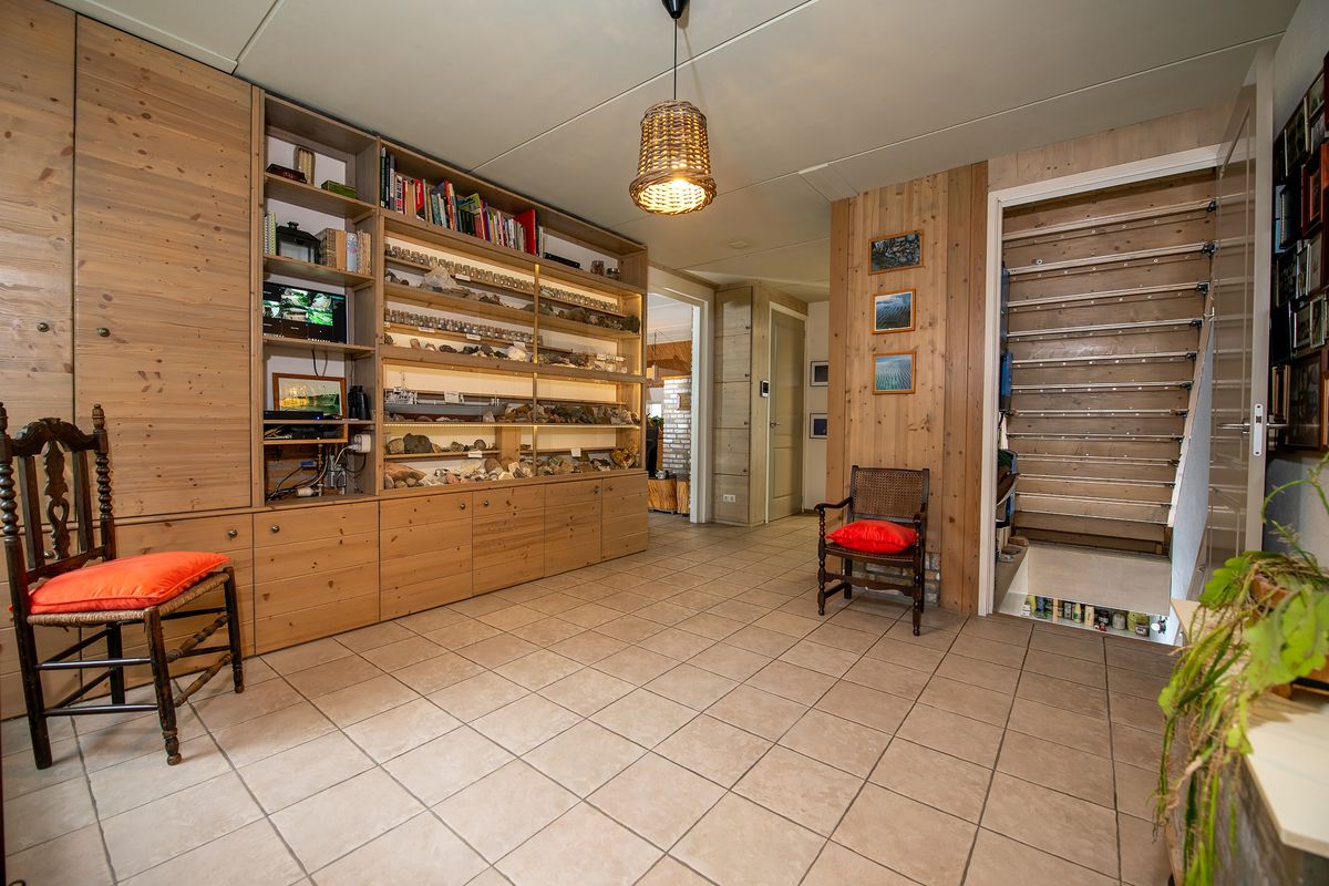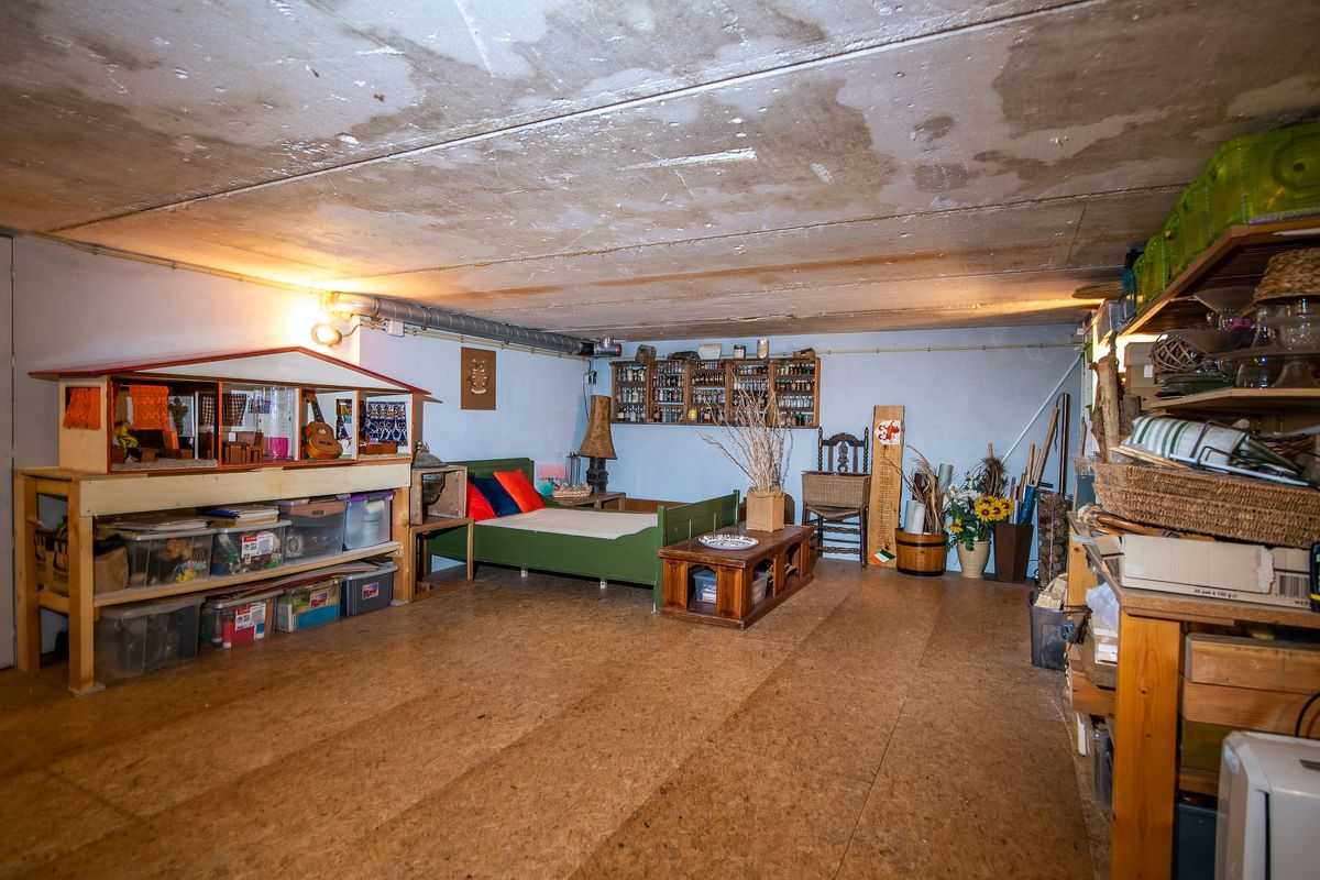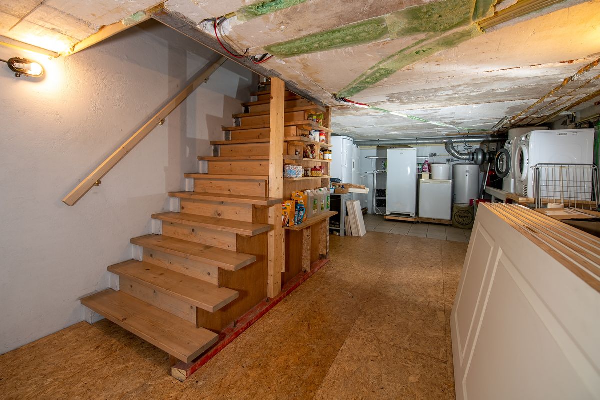 De trap in de hal naar beneden leidt naar een kelder op stahoogte die zich onder de gehele woning uitstrekt. De kelder is verdeeld in ruimtes voor opslag, apparatuur, aansluitingen voor wasmachine en droger, een slaap/logeergedeelte en een grote werkplaats.