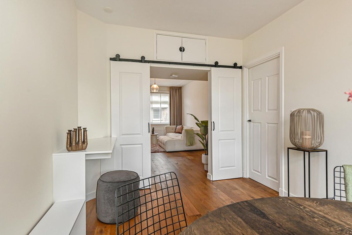 De lichte woonkamer met ensuite deuren met inbouwkasten en een fraaie ombouw in de achterkamer waarop u kunt zitten biedt volop ruimte en sfeer. De pelletkachel (2019) verwarmt niet alleen de radiatoren maar zorgt ook voor een gezellig, knapperend vuurtje in de wintermaanden.
