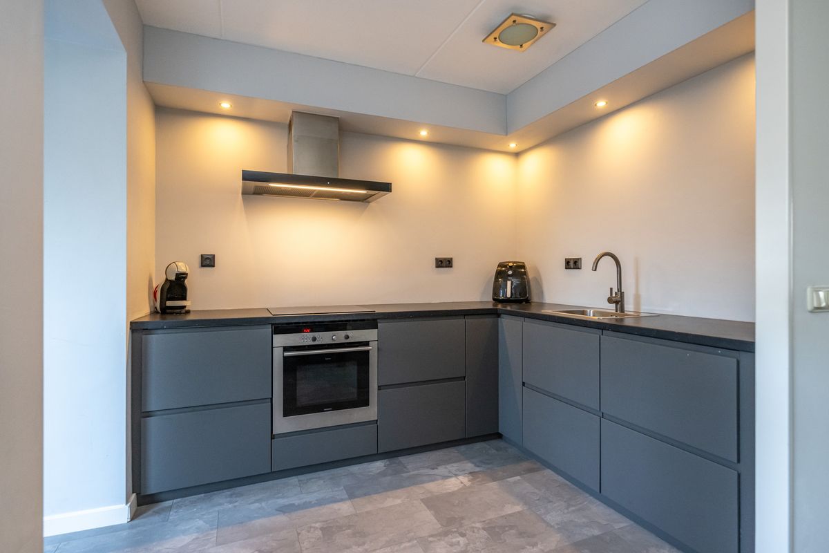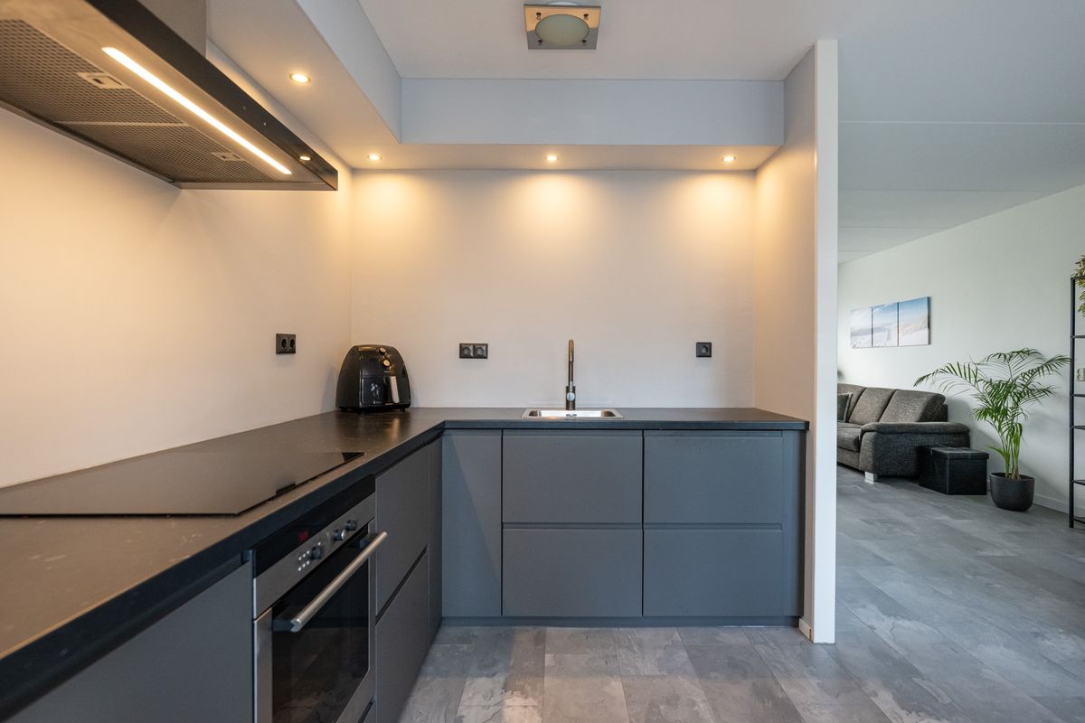 Inductiekookplaat, afzuigkap, vaatwasser, enkele spoelbak, oven, spots en een laminaatvloer.