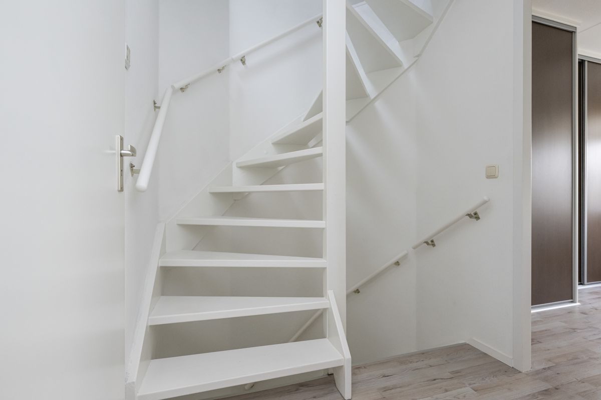 Laminaatvloer, radiatoren, trapopgang en trapkast.
