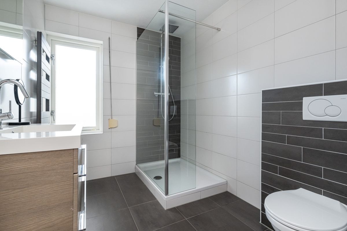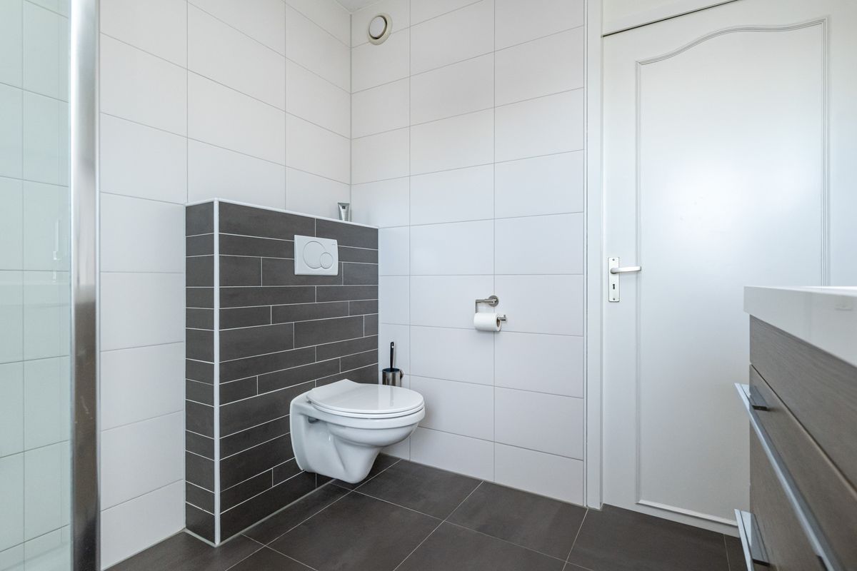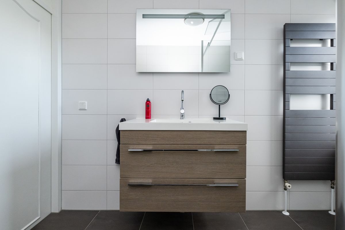 Douche, zwevend toilet, wastafel met meubel, spiegel met verlichting, designradiator, geheel betegeld en rolluik.