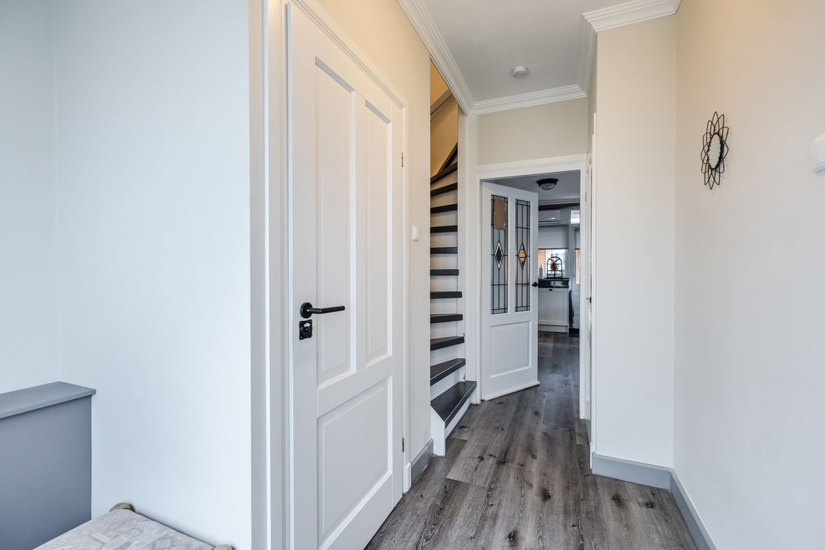 Entree, modern wandcloset, vernieuwde meterkast, trapopgang, open keuken met trapkast en L-vormige inbouwkeuken (2019) voorzien van diverse inbouwapparatuur, rechthoekige doorzon woonkamer met zicht op gemeentelijk plantsoen, vanuit keuken heeft u toegang tot de overkapping welke kan worden afgesloten met glazen schuifwanden en toegang biedt tot bijkeuken en hobbyruimte en toegang tot de garage.