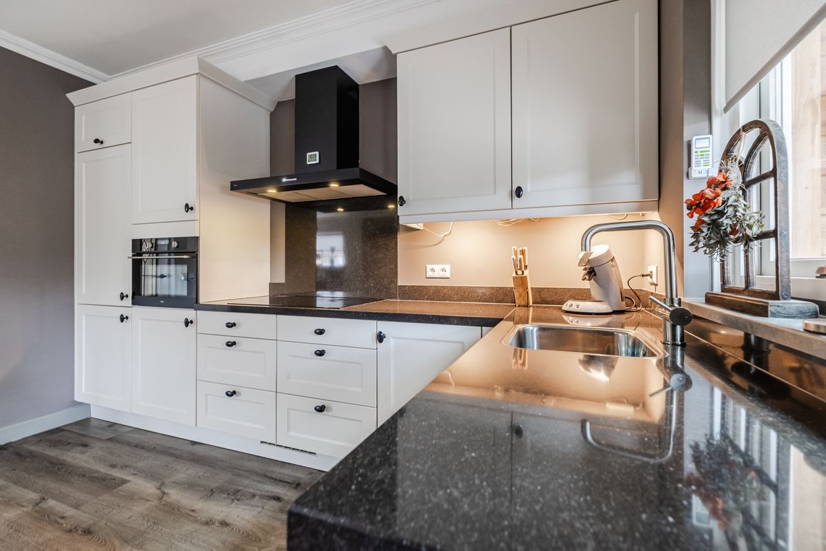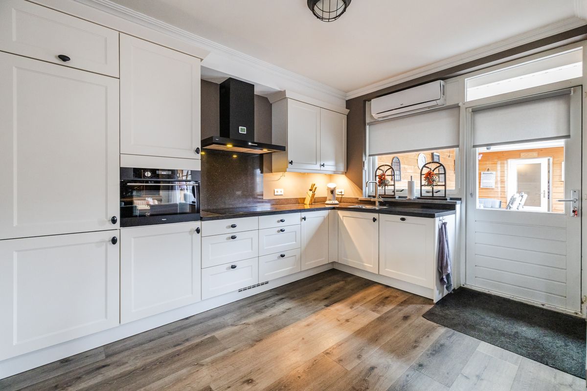 - Aangebouwde bijkeuken met afzonderlijke hobbyruimte/chill-ruimte en aangrenzende garage met een afmeting van