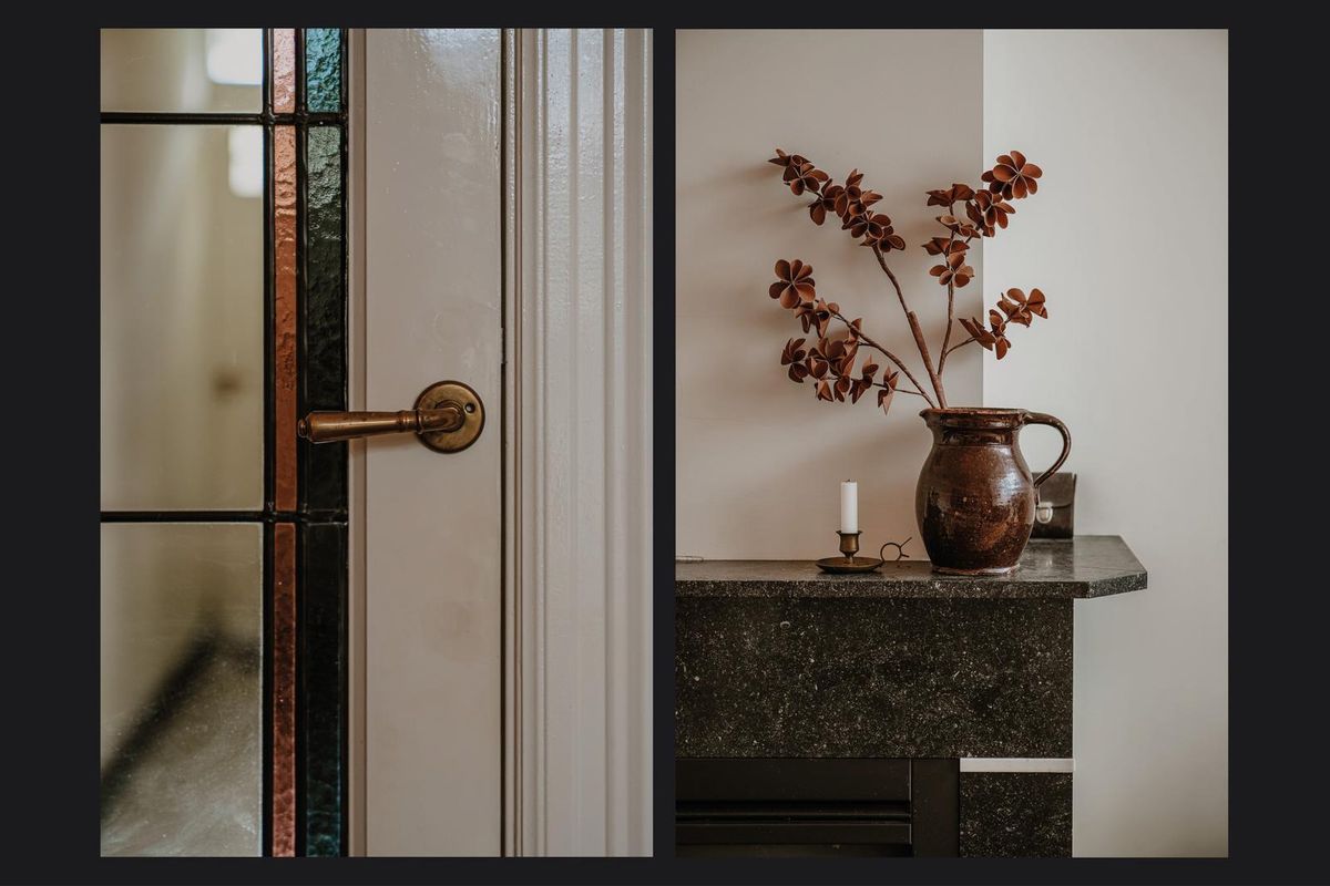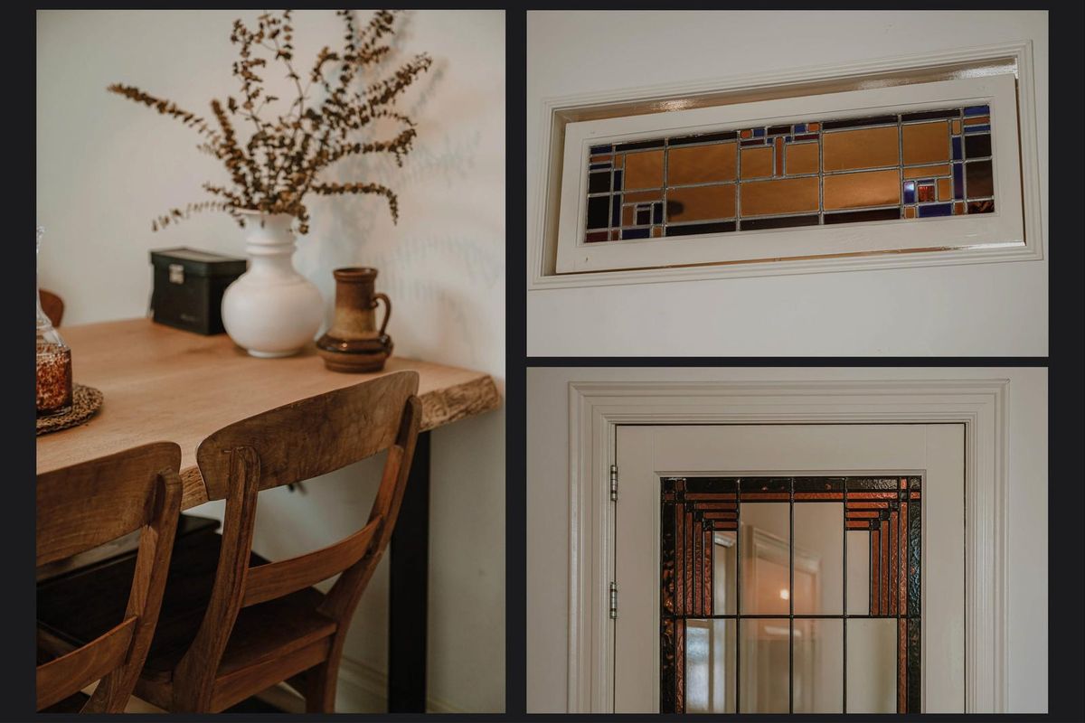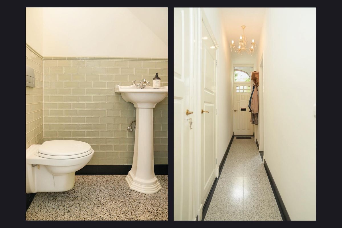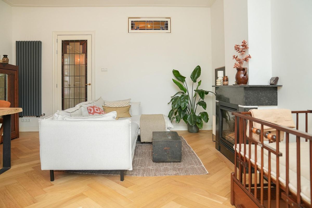 Entree, ruime en lange hal met toilet met fonteintje en een royale kast voor extra bergruimte, garderobekast/meterkast. Ruime slaapkamer aan de voorzijde met badkamer en-suite. Deze is voorzien van inloopdouche en dubbel wastafelmeubel. Onder de wastafel is er ruimte voor wasmachine en droger. Doorgang naar bijzonder fraaie en sfeervolle woon-eetkamer met o.a. massief houten visgraten vloer, authentieke gashaard, hoge plafonds, glad stucwerk en een hoogwaardige keuken met complete inbouwapparatuur + lichtstraat en bestaand uit 2 delen. Vanuit de keuken is er d.m.v. openslaande deuren toegang tot de zonnige tuin (NW). De tuin is bijzonder sfeervol te noemen met een fraaie blauweregen tegen de voorgevel en druif in de achtertuin. De achtertuin heeft tevens een eigen achterom welke middels poort toegankelijk is.