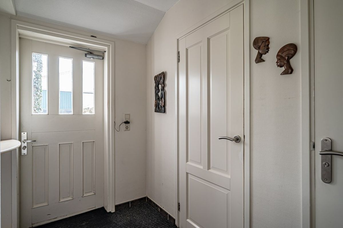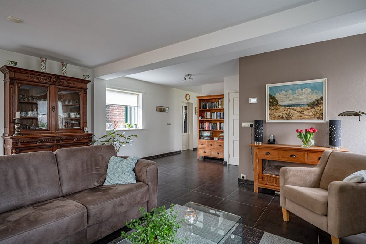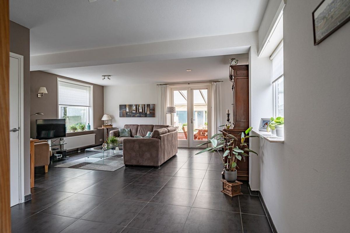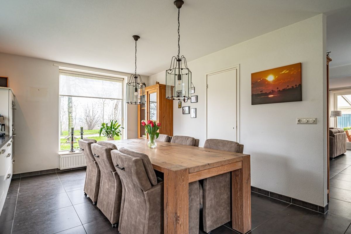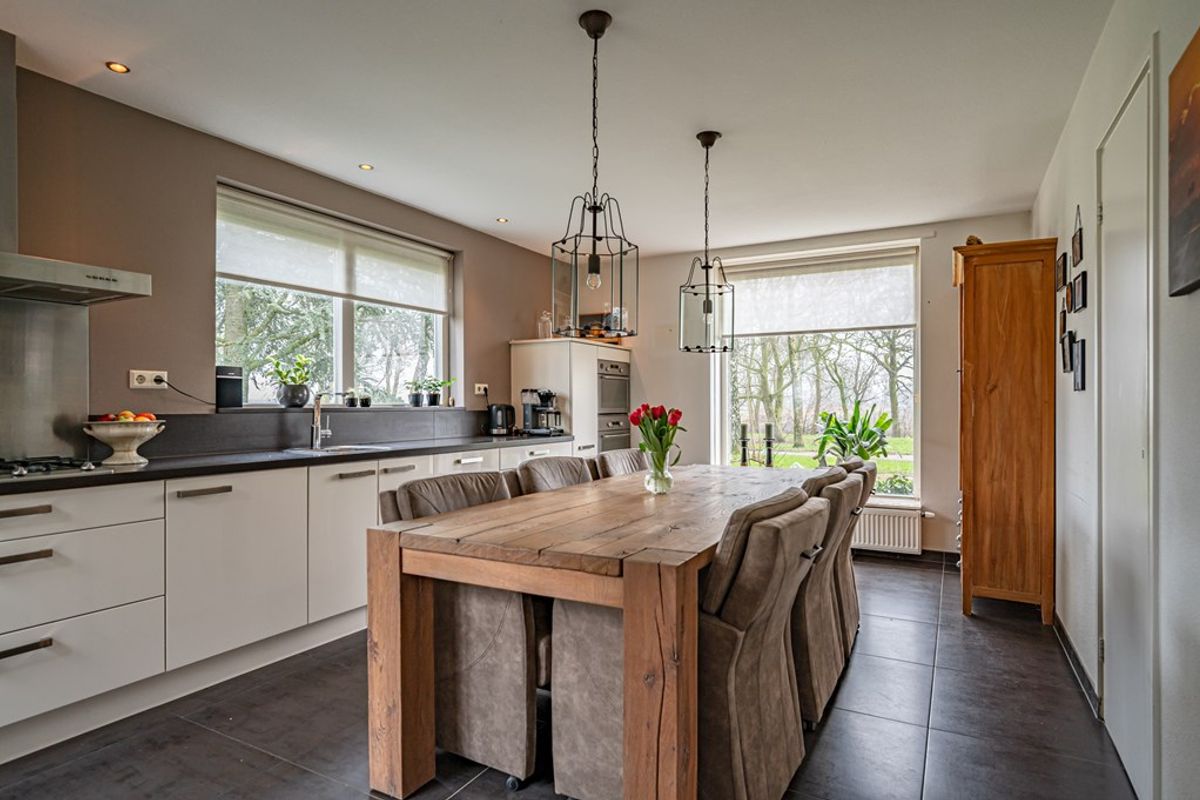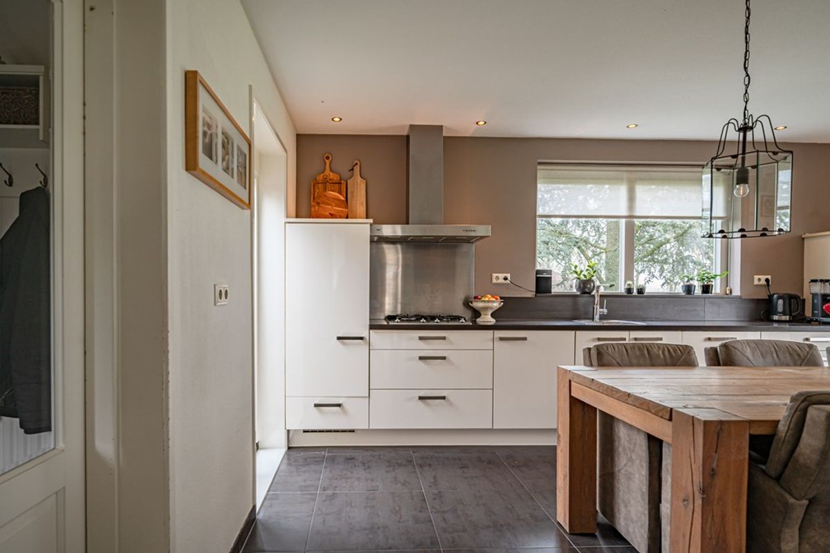 Entree/hal met garderobe, bijkeuken met opstelling CV-combiketel, keukenblok met koelkast, wastafel en bergkastjes. Moderne toiletruimte met hangend toilet en fontein. Riante woonkeuken met moderne keukenopstelling voorzien van 4 pits gaskookplaat, vaatwasser, koelkast, oven en magnetron, en een aparte inbouwkast. De keuken beschikt over veel raampartijen en biedt een heerlijk vrij uitzicht over de tuin. Ruime woonkamer met openslaande tuindeuren naar de serre. De woonkamer heeft ideale afmetingen en veel daglicht. Keuken en woonkamer zijn voorzien van vloerverwarming en plavuizen. Hal met toegang tot de kelder en trapopgang. De aangebouwde serre wordt door de huidige eigenaar veel gebruikt als extra woonkamer en is voorzien van gaskachel.