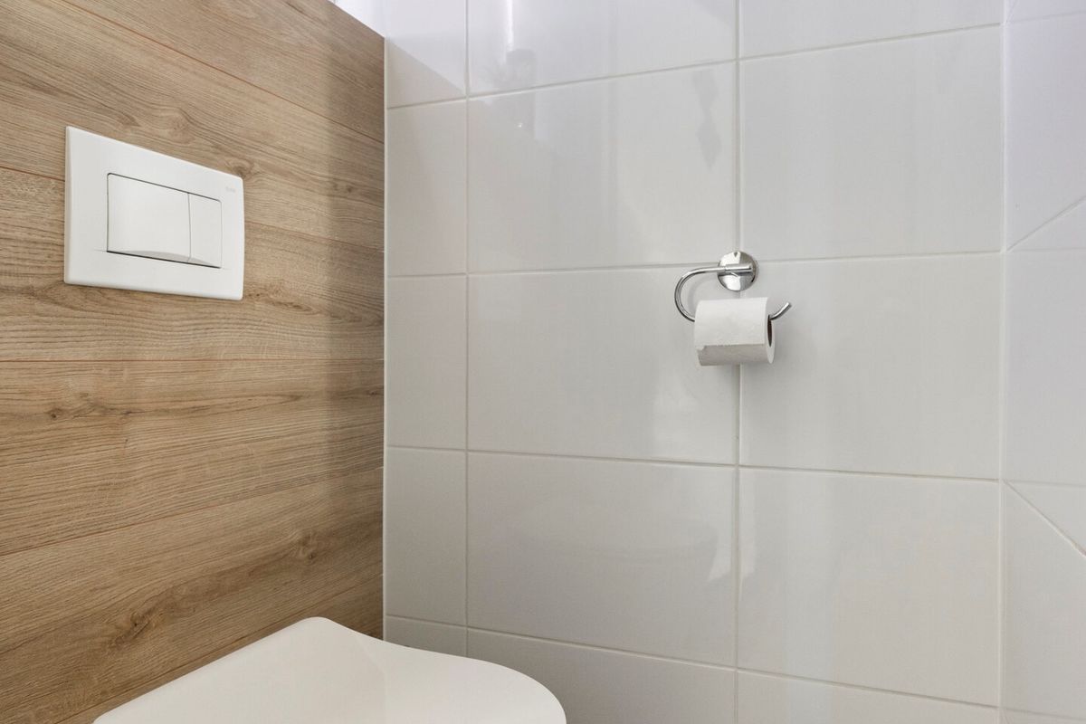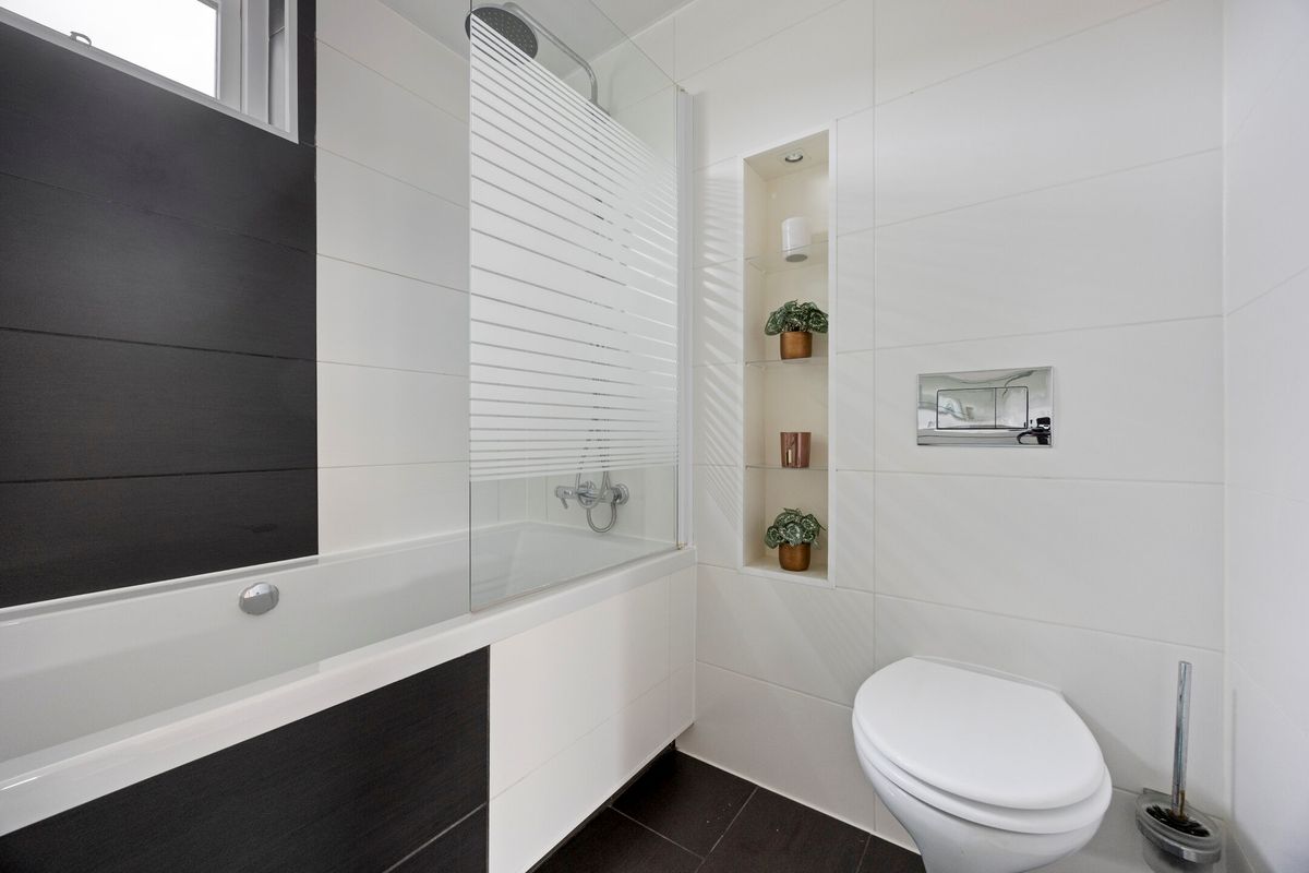 1e verdieping: overloop, 3 slaapkamers waarvan één met een ingebouwde walk-in closet, nette badkamer met de douche in het ligbad, dubbele wastafel met wastafelmeubel en 2e toilet.