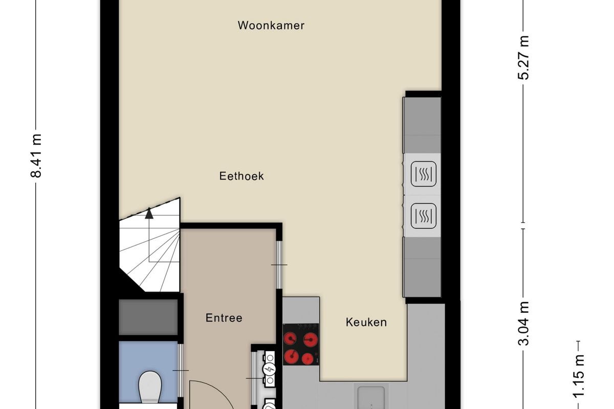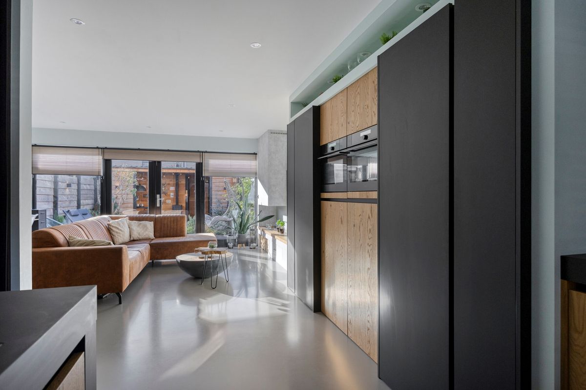 Begane grond: entree, hal met meterkast, toilet, ruime en lichte woonkamer, royale luxe keuken met inbouwapparaten en openslaande deuren naar de diepe achtertuin (Z) met overkapping, berging en achterom.
